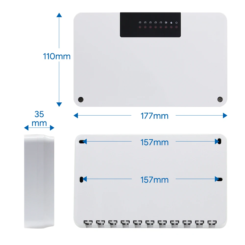 CCT-28 8 채널이며 8 개의 존 밸브가 있으며 각 밸브는 1 개의 온수 가열 온도 컨트롤러와 3 개의 정상 폐쇄 액추에이터에 연결할 수 있습니다.