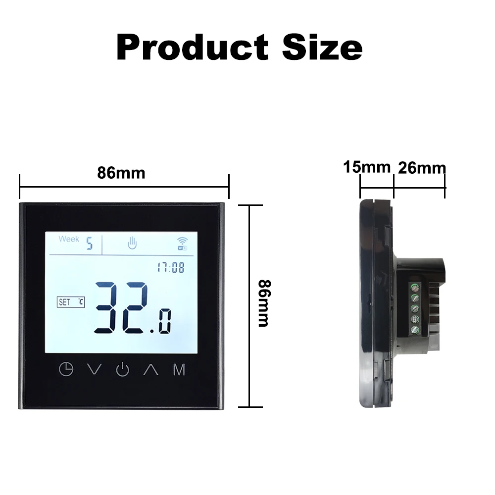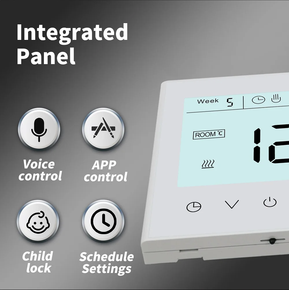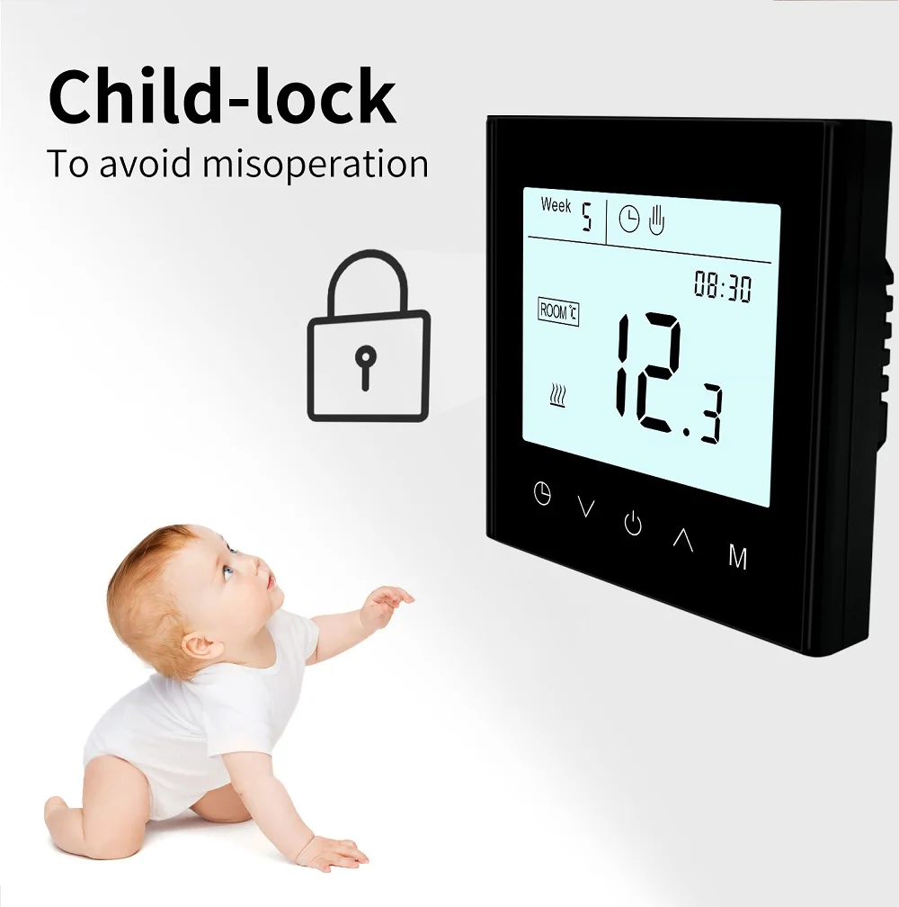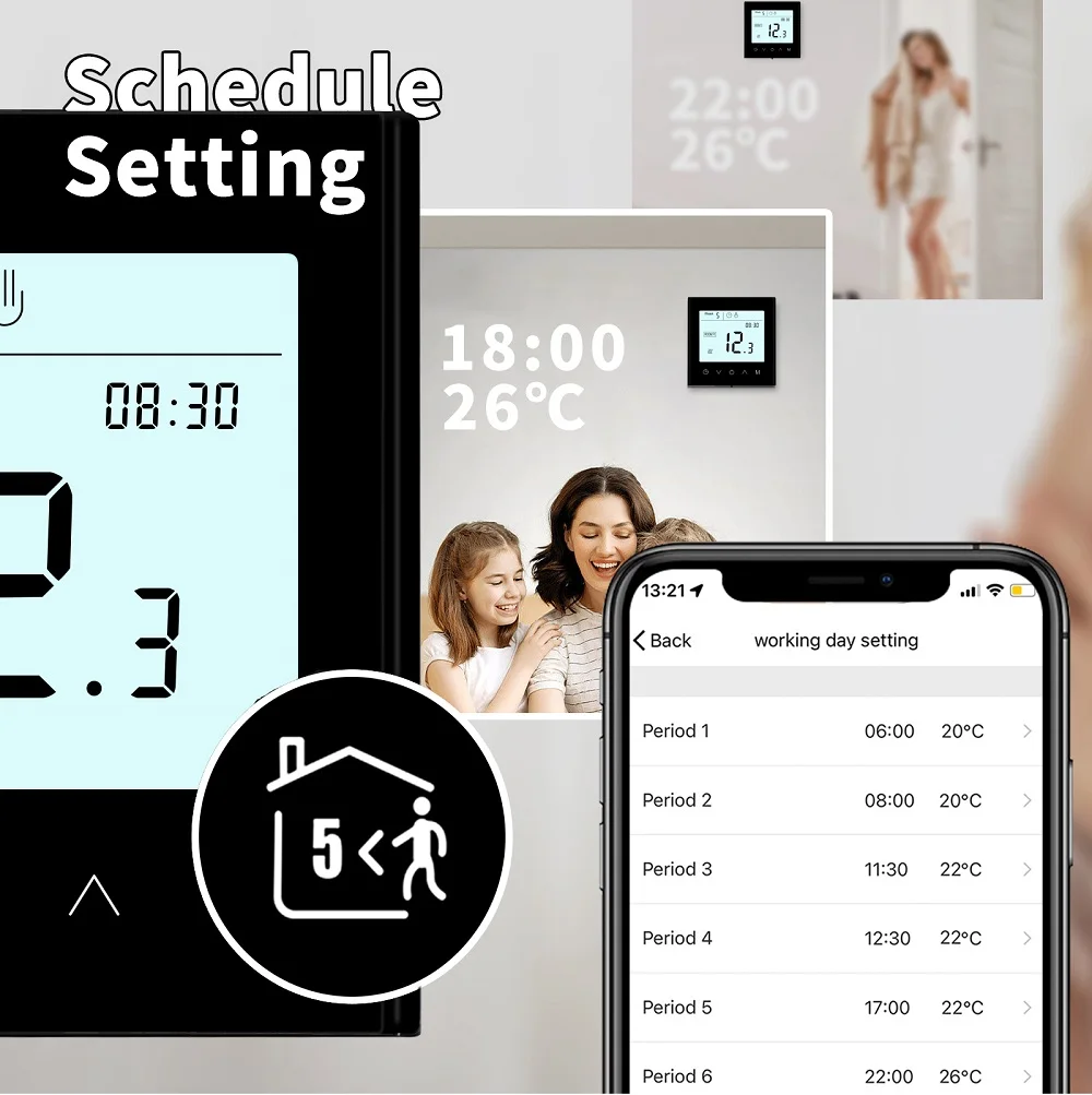 3. 주간 프로그래밍 가능: 프로그래밍 가능한 기능 5 + 2, 6 + 1 및 7 일 주간 프로그래밍 가능, 6 시간 프로그래밍 가능, 온도 설정 제어.