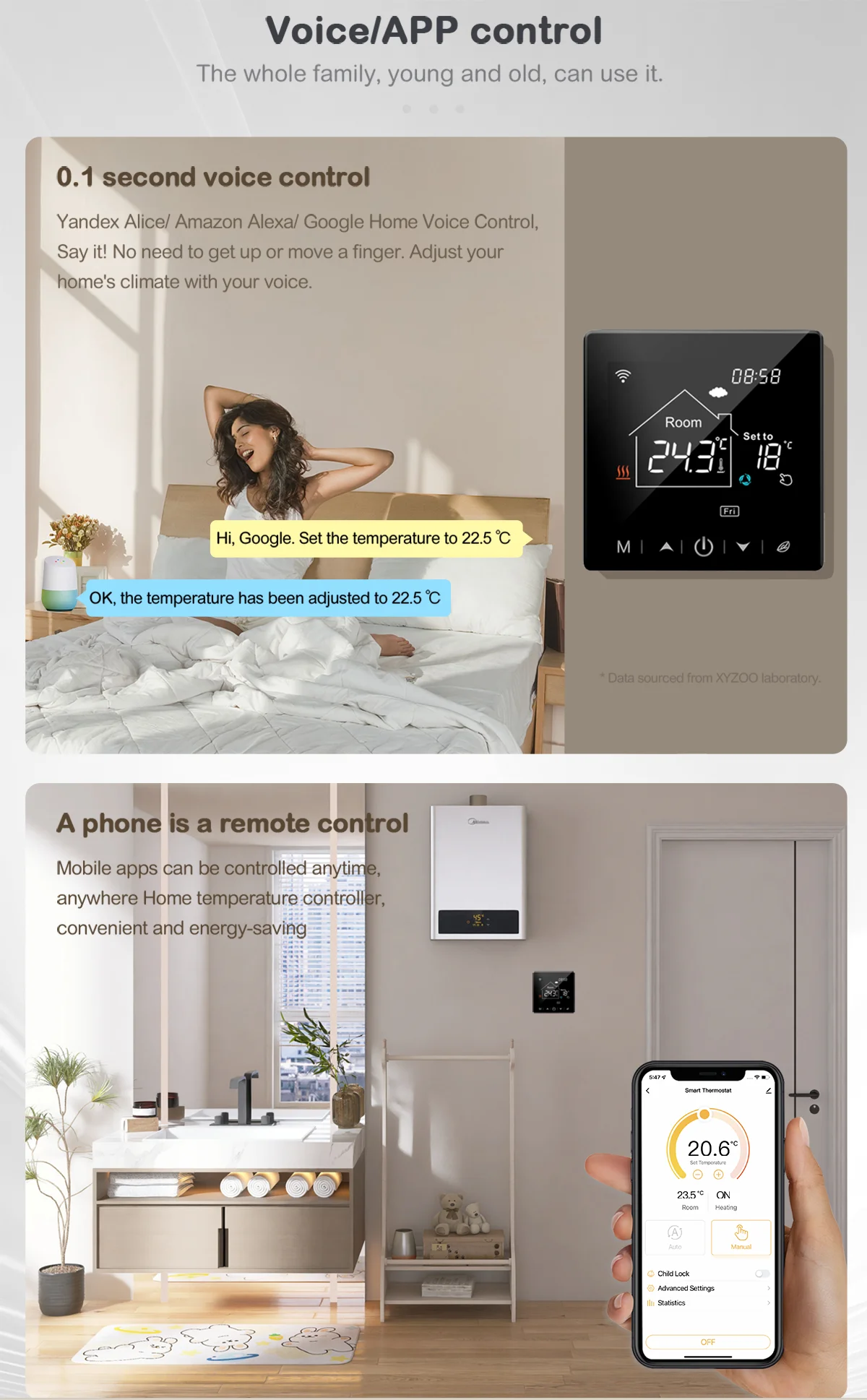 【스마트 보이스 컨트롤】: 음성을 사용하여 집의 온도를 제어하기 만하면됩니다. EZAIOT는 Yandex Alice, Google 어시스턴트 및 Amazon Alexa와 호환됩니다.