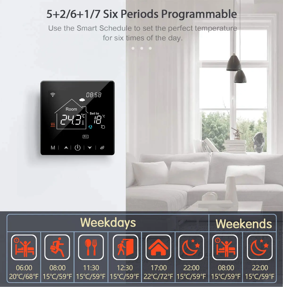 【주간 일정 기능】: 매일 6 시간 동안 6 + 1, 5 + 2 및 7 일 동안 주간 온도를 자동 또는 수동으로 설정하여 라이프 스타일에 맞는 일정을 만듭니다.