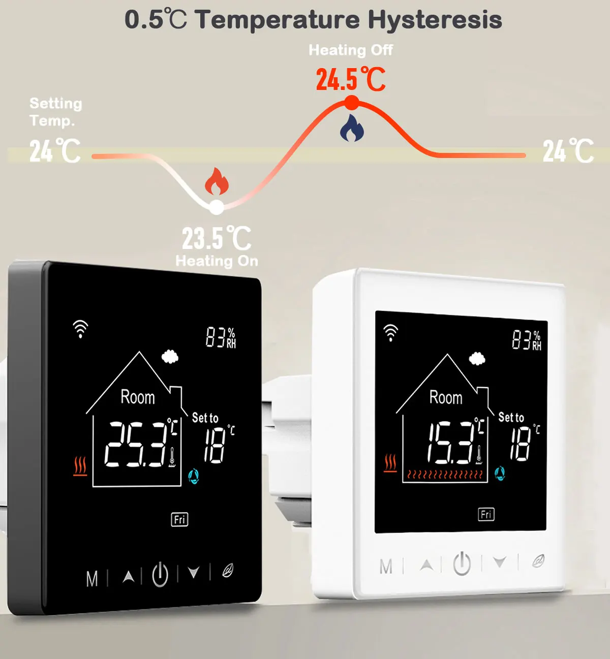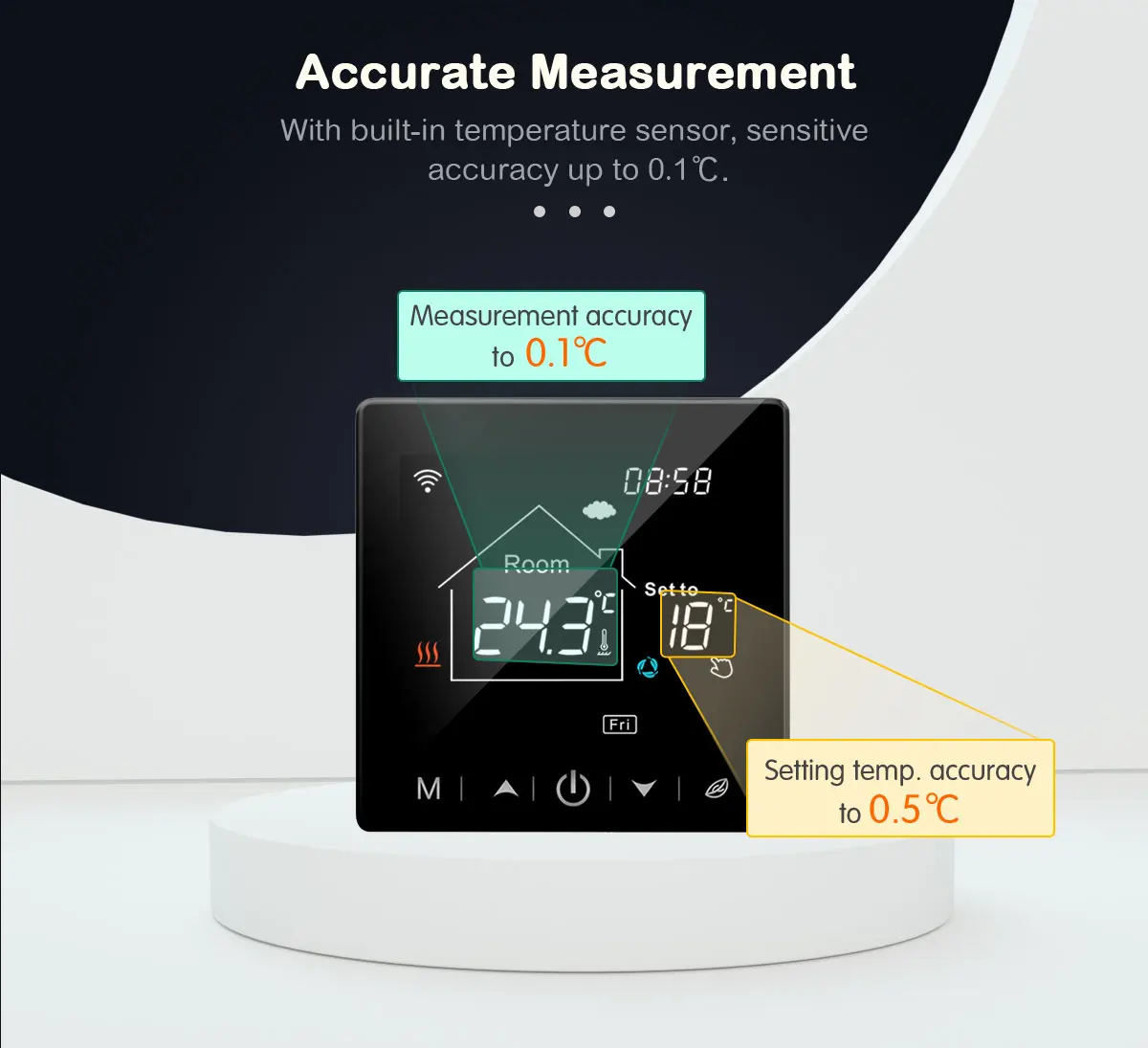 【하나의 키 에너지 절약】: 정확한 온도 설정, 내장 온도 센서, 최대 0.1 ℃의 민감한 정확도, 하나의 키로 18 ℃의 에너지 절약 모드를 켤 수 있습니다. 에너지 절약과 편안함.