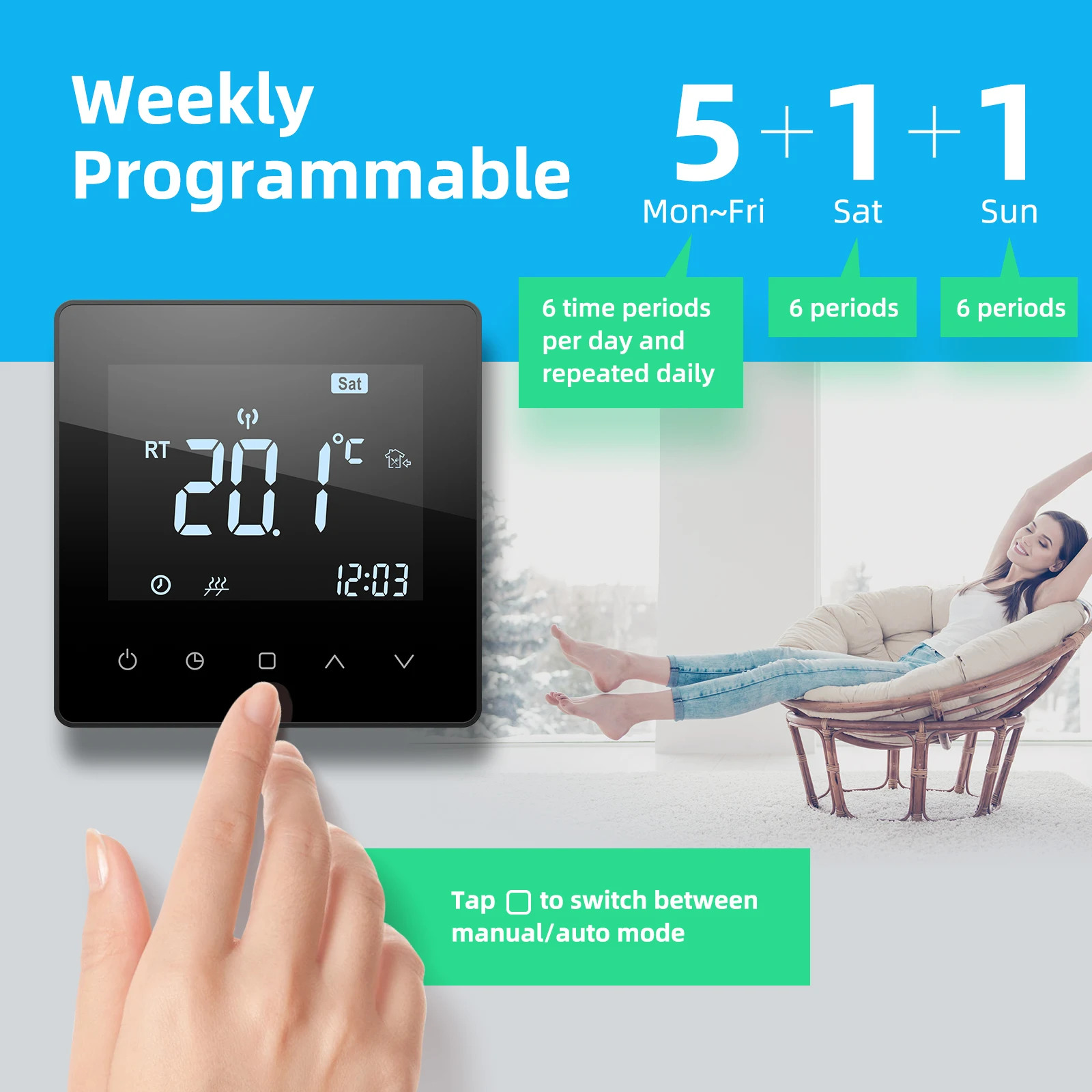 【프로그래밍 가능】 프로그래밍 모드: 5 + 1 + 1, 온도는 근무 일과 휴식 일 모두 하루에 6 시간 동안 설정할 수 있습니다.