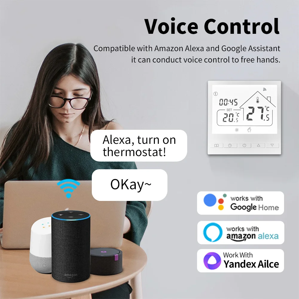 스마트 와이파이 온도 조절기는 아마존 알렉사, 구글 홈, Yandex 앨리스와 완벽하게 호환됩니다. Yandex Alice,Alexa 또는 Google Home Assistant에 음성 명령을 내리면 이동 중에도 기기를 제어 할 수 있습니다.