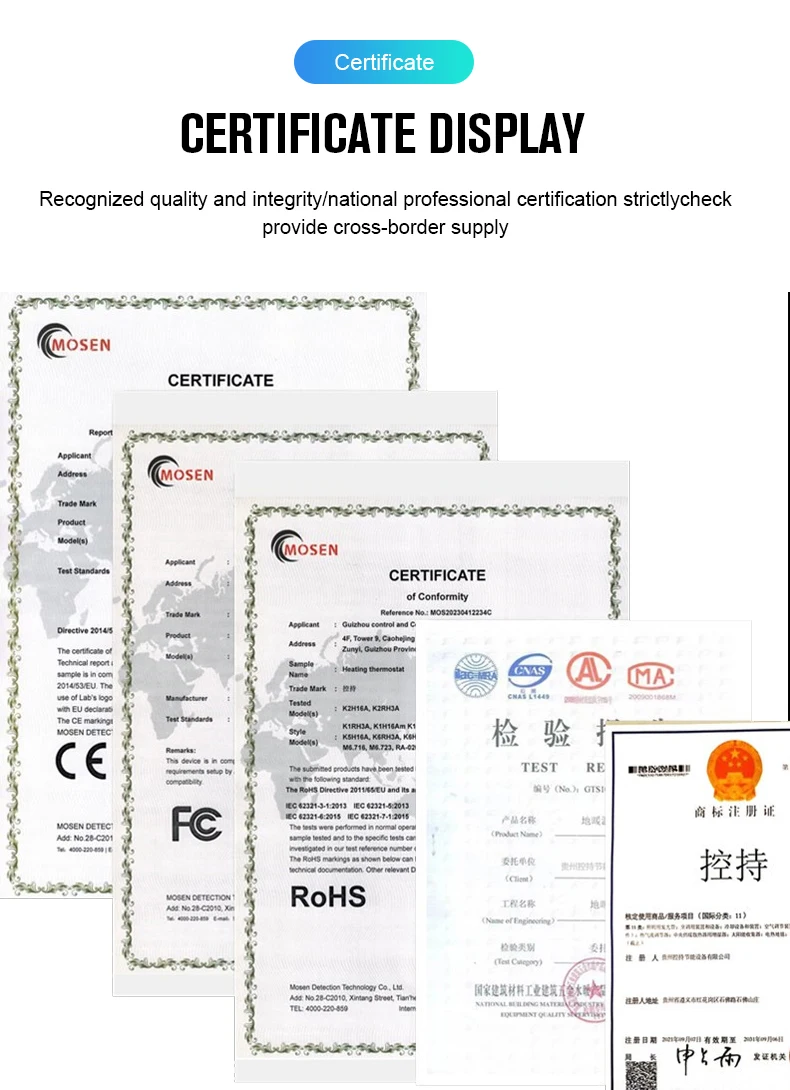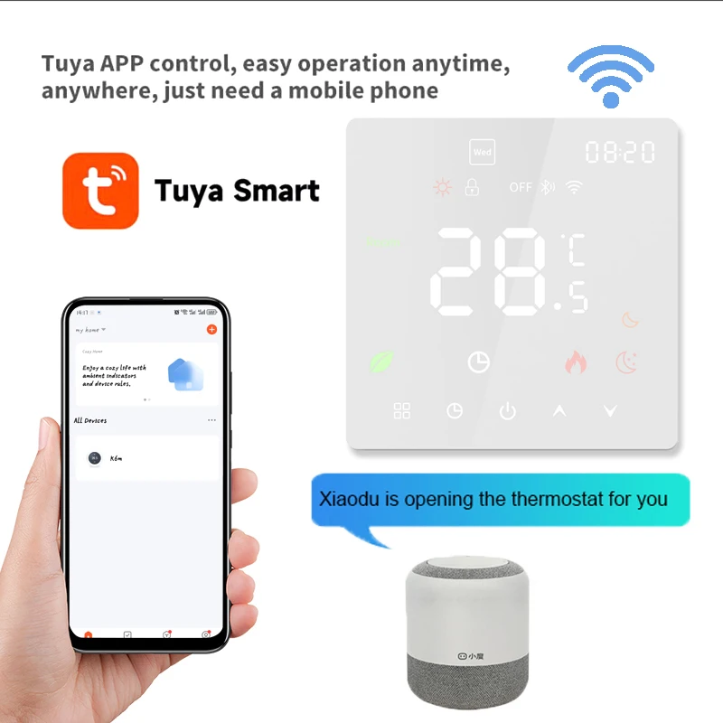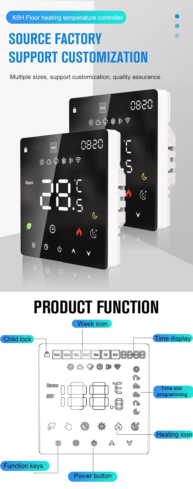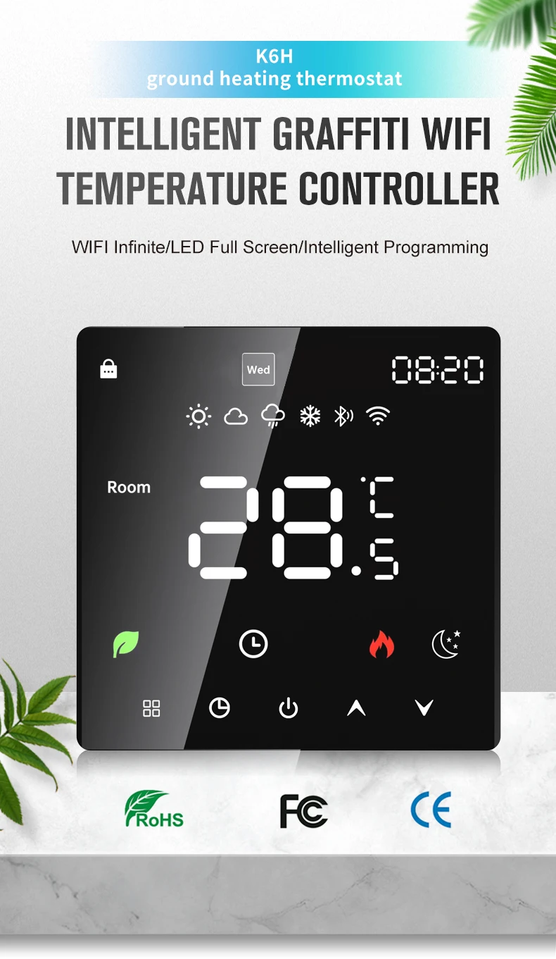 스마트 물 가열 온도 조절기는 가정용 바닥 난방 시스템 또는 보일러와 같은 난방 시스템의 실내 온도 제어에 적합합니다. 아시아, 유럽 및 미국에서 널리 사용할 수 있습니다. 장식 스타일을 완벽하게 혼합하고 커스터마이징을 지원합니다.