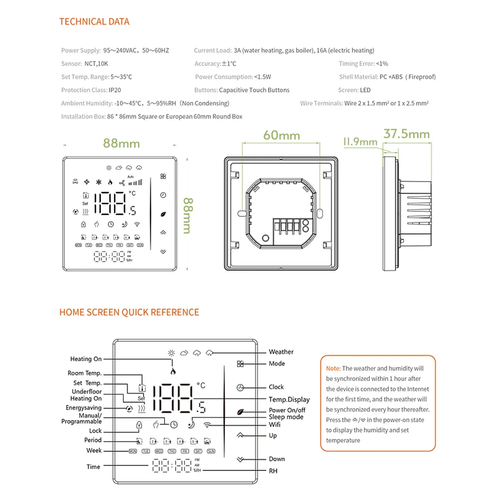 【WiFi 스마트 온도 조절기】LCD 디스플레이가 장착된 이 WiFi 스마트 온도 조절기는 초박형 벽걸이 본체와 터치 조작 버튼 디자인을 채택하여 설치가 쉽고 사용이 간편합니다. 표준 86mm 정사각형 카세트 및 60mm 유럽 카세트와 호환됩니다.
