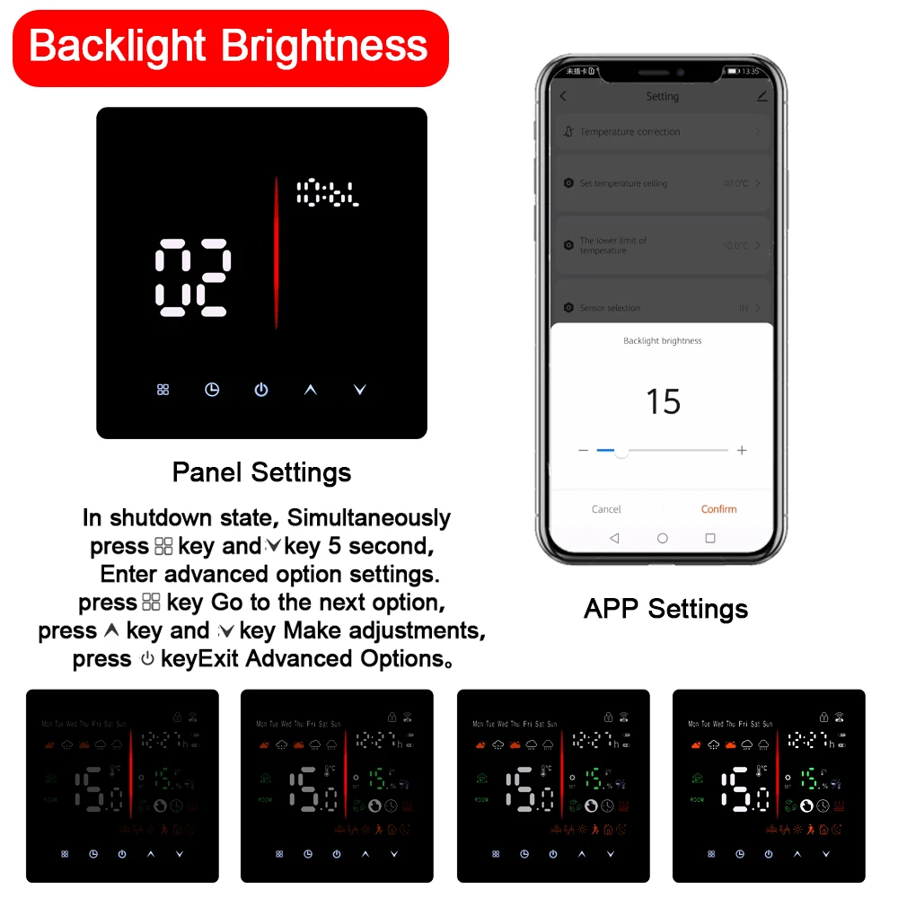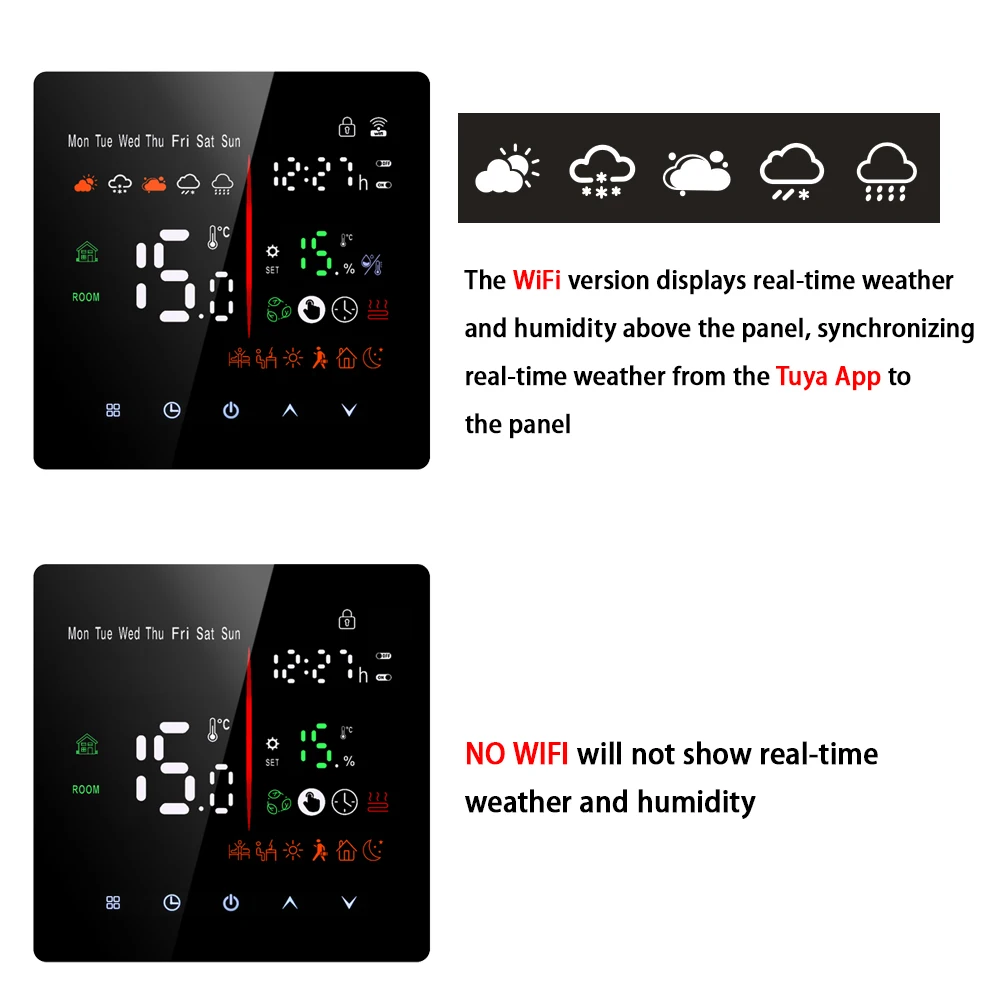 지능형 디지털 온도 조절기실내 온도 제어 및 가정용 온도 제어에 적합한 바닥 난방 시스템으로 주변 온도와 설정 온도의 비교를 감지하여 바닥 난방 장비의 작동 상태를 제어합니다. 에너지 절약 목표를 달성하면서 편안함을 향상시킵니다. 디지털 서모 스탯, 마이크로 컴퓨터 제어 기술을 채택하고 터치 버튼을 전체 화면으로 표시합니다. 디자인은 우아하고 관대하며 사용하기 쉽습니다. 온도 컨트롤러는 수동 및 자동 기능, 프로그래밍 가능한 기능, 상태 메모리 기능, 어린이 잠금 기능을 갖추고 있으며 WIFI로 날씨와 습도를 얻을 수 있습니다.