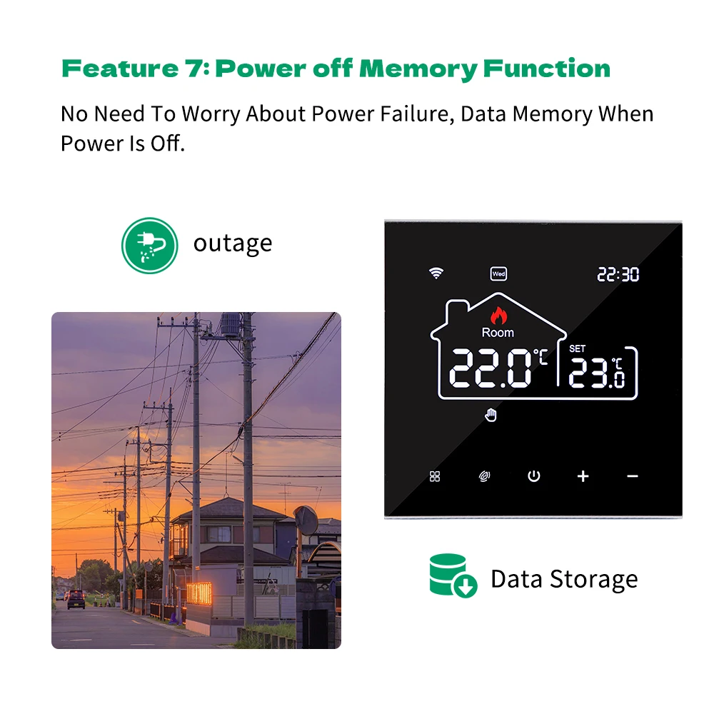 온도 조절기는 매일 6 가지 시간 모드로 다른 온도 설정을 지원합니다. 7 일 프로그래밍 가능