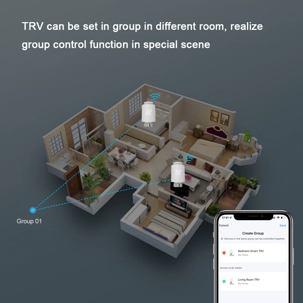TRV는 다른 방에서 그룹으로 설정할 수 있어, 특별한 장면에서 그룹 컨트롤 기능을 실현합니다.