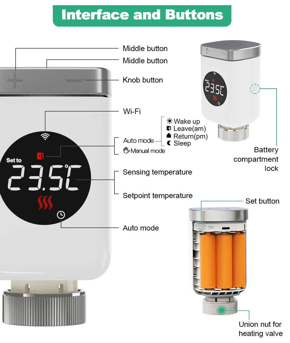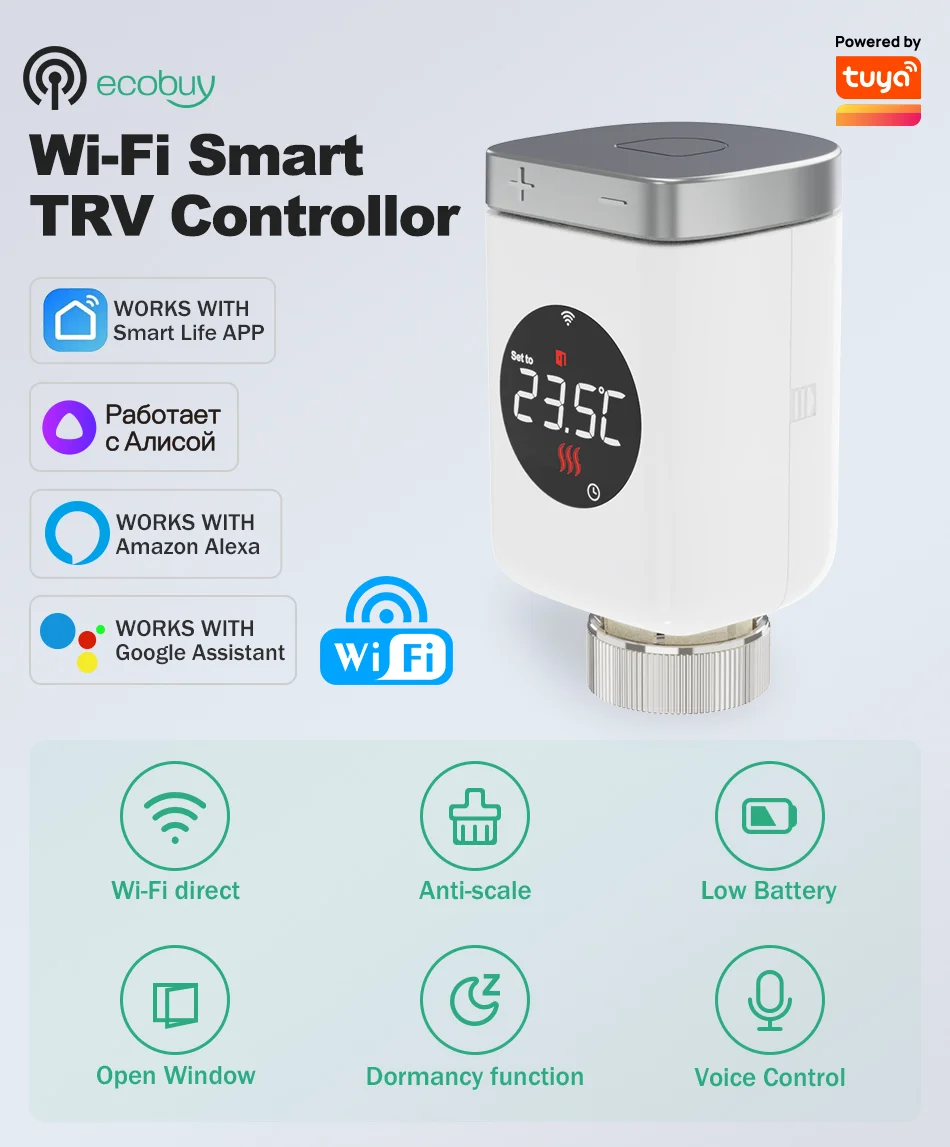 TRV801W Tuya 스마트 WiFi 온도 조절 라디에이터 밸브 액추에이터 스마트 라이프 무선 원격 제어 홈 난방 온도 조절기 온도 컨트롤러 Alexa Google 홈 음성 제어