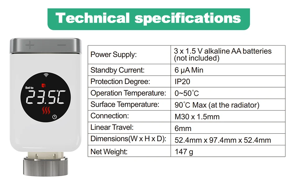 이 투야 스마트 홈 TRV는 배터리로 전원이 공급되며 Wi-Fi를 통해 휴대 전화에 직접 연결할 수 있습니다.