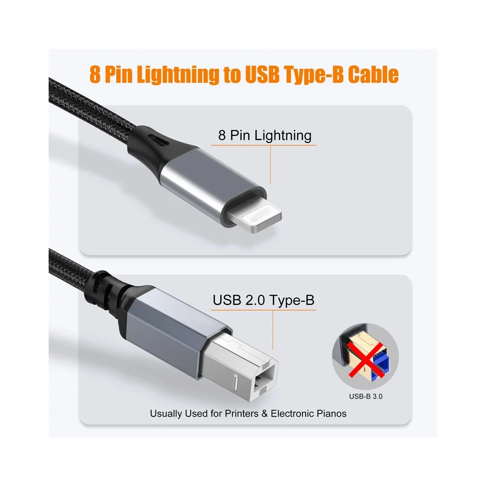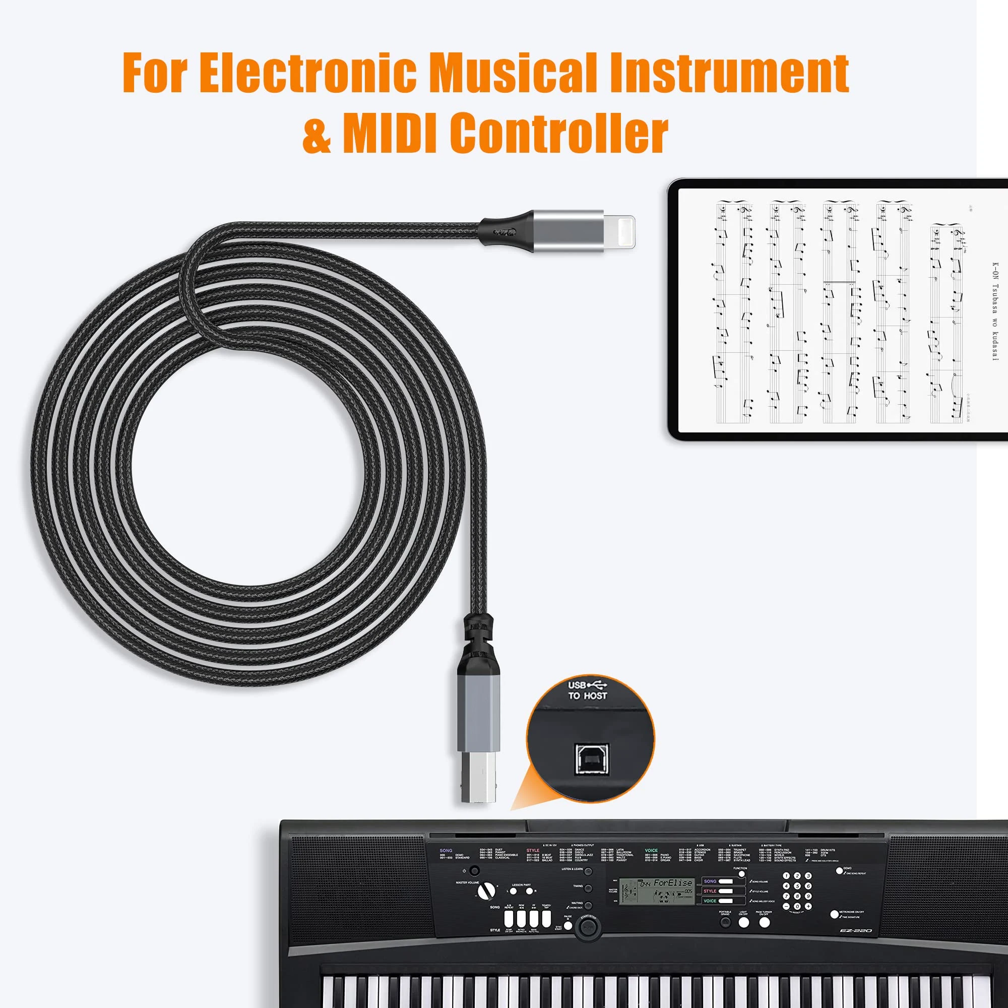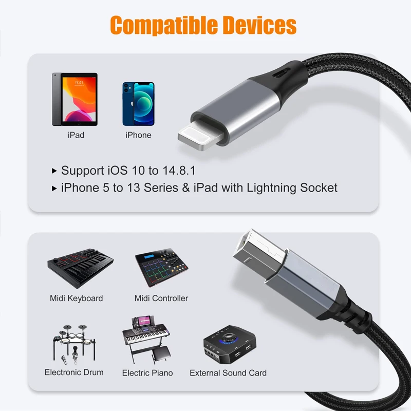 ?[플러그 앤 플레이]MIDI 케이블을 USB-B 이러한 번개 인터페이스는 플러그 앤 플레이, 드라이버가 필요하지 않습니다. 노트북에 번개 수컷을 연결하고 MIDI 장치에 플러그를 USB-B. 전자 드럼, MIDI 키보드, 키보드, 일렉트릭 기타, 디지털 피아노와 같은 MIDI 인터페이스 장치를 지원합니다.