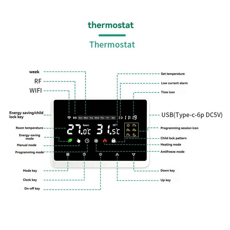 [주간 프로그램 가능]-서모 스탯은 매일 6 가지 시간 모드에 따라 다른 온도 설정을 지원합니다.