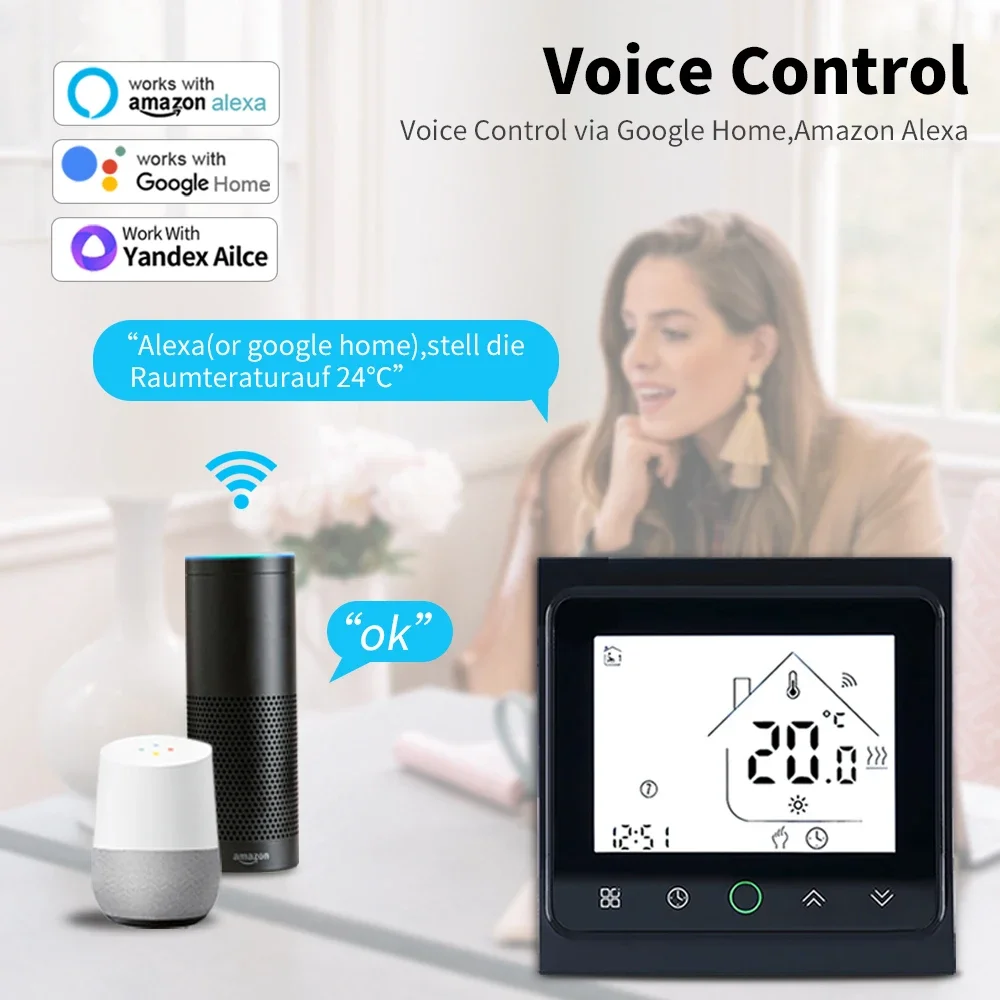 ● 음성 제어 스마트 와이파이 온도 조절기는 아마존 알렉사, 구글 홈, Yandex 앨리스와 완벽하게 호환됩니다. Yandex Alice,Alexa 또는 Google Home Assistant에 음성 명령을 내리면 이동 중에도 기기를 제어 할 수 있습니다.