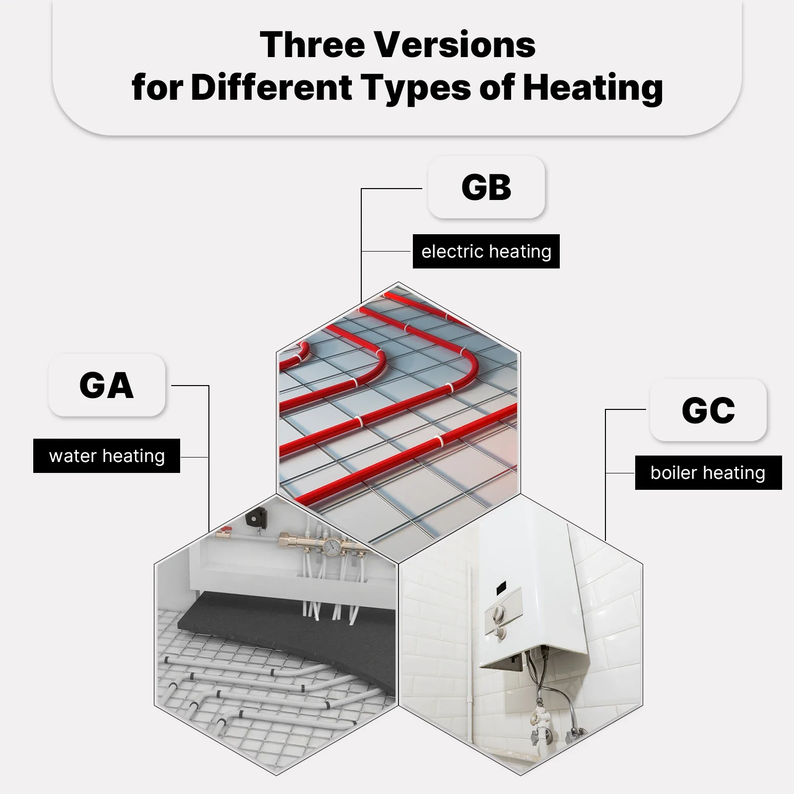 이 세 제품은 물 가열, 전기 가열 및 보일러와 같은 다양한 가열 방법을 위해 설계되었습니다. 가정용 난방 방법 따라 해당 GA, GB 또는 GC 온도 조절기를 선택하십시오.