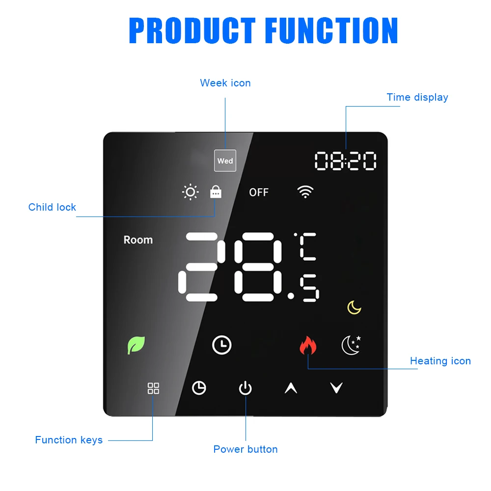 LCD 터치 스크린 디스플레이: 지능형 서모 스탯에는 LCD 컬러 스크린과 NTC 센서가 장착되어있어 정확하고 투명한 온도 판독 값을 제공하여 주변을 쉽게 모니터링 할 수 있습니다.