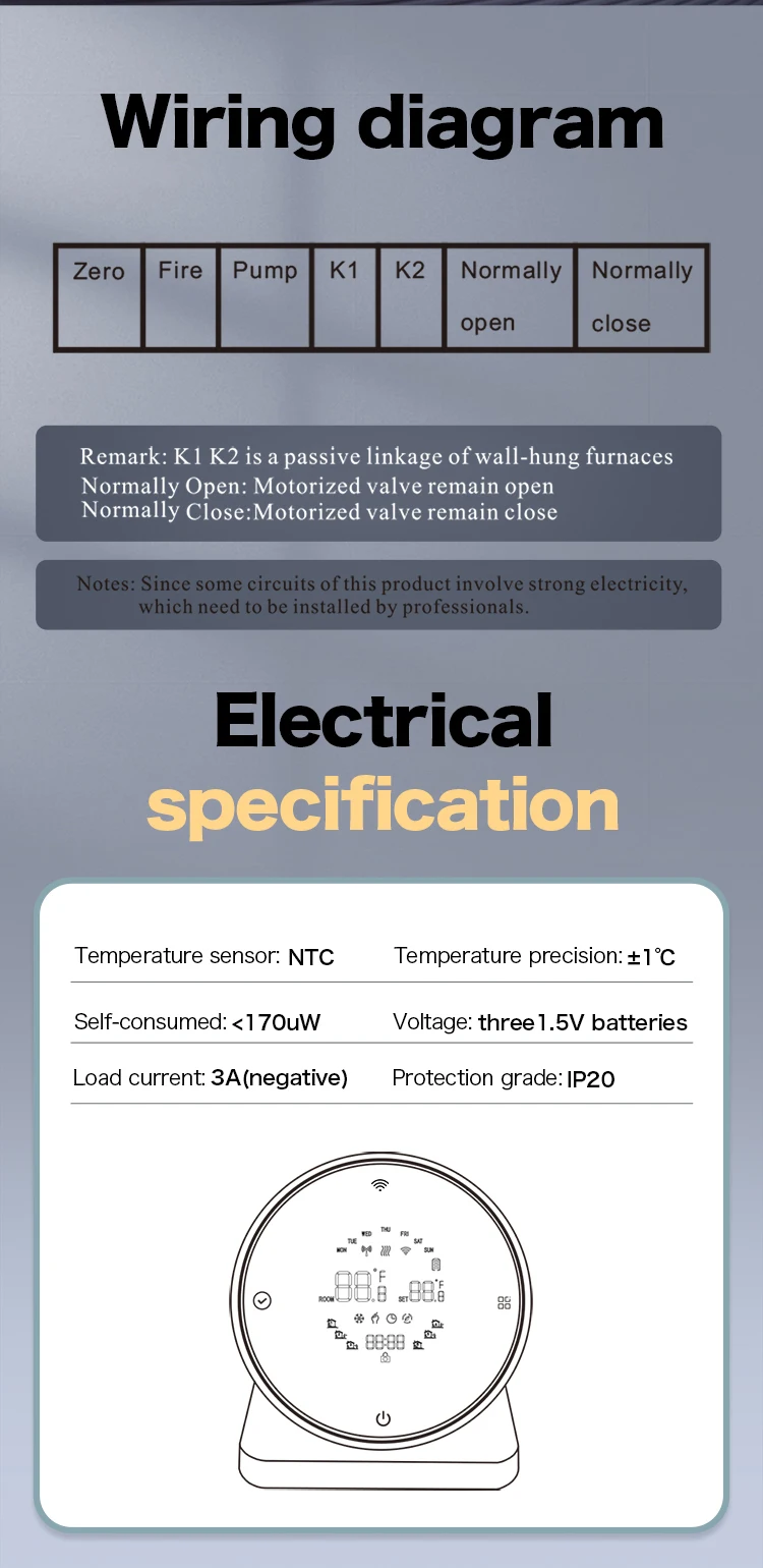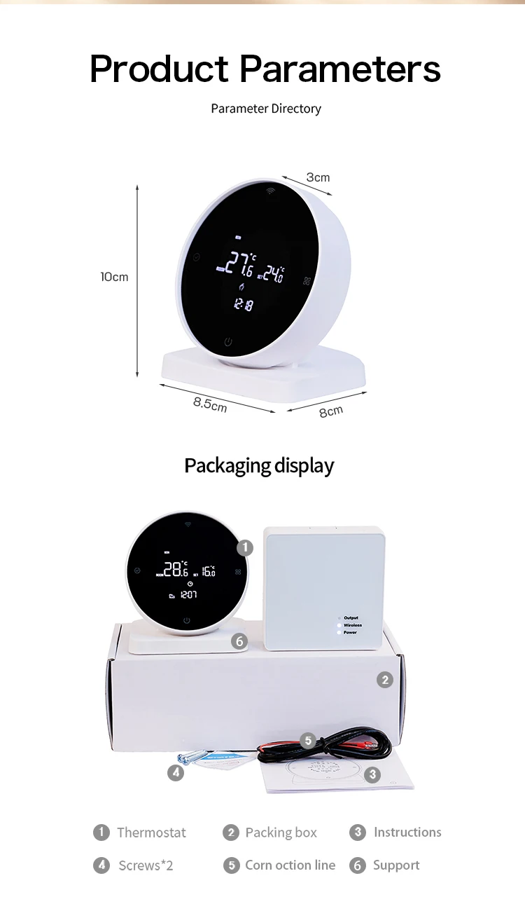 WIFI 서모 스탯은 Tuya APP 및 Smart Life APP와 함께 작동하며 Google Home, Yandex Alice 및 Amazon Alexa와의 사용을 지원하며 가스 보일러 용 무선 서모 스탯입니다. 수신기가 패키지에 포함되어 있습니다. 가스 보일러는 수신기에 연결해야합니다! USB 및 배터리 전원 (두 가지 방법을 함께 사용할 수 없으며 배터리는 패키지에 포함되어 있지 않습니다)