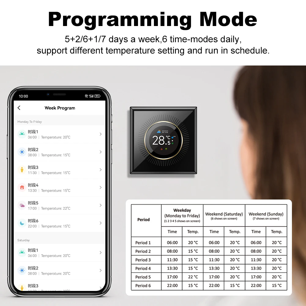 프로그래밍 모드: 5 + 2/6 + 주 1/7 일, 매일 6 시간 모드, 다양한 온도 설정 지원 및 일정 실행
