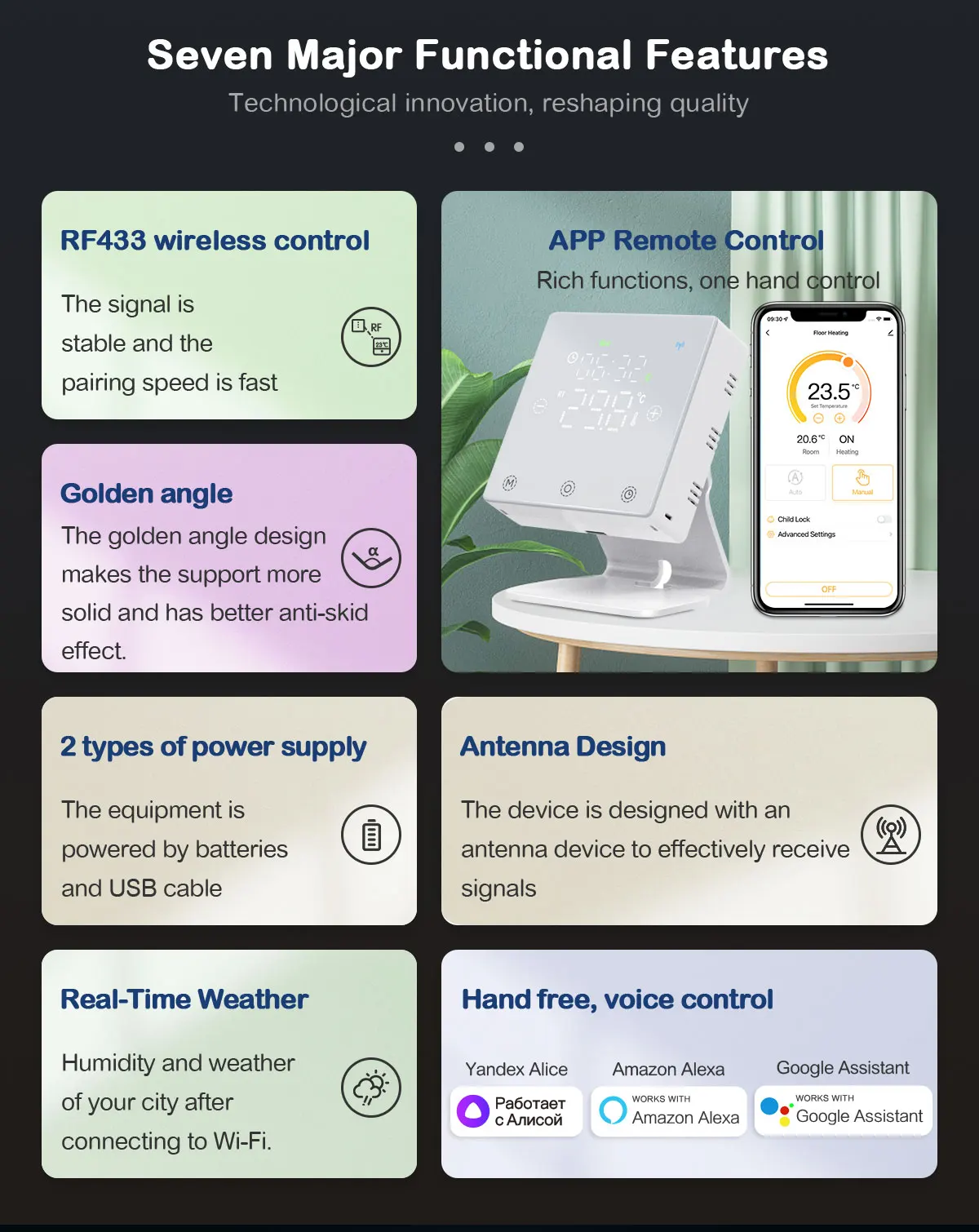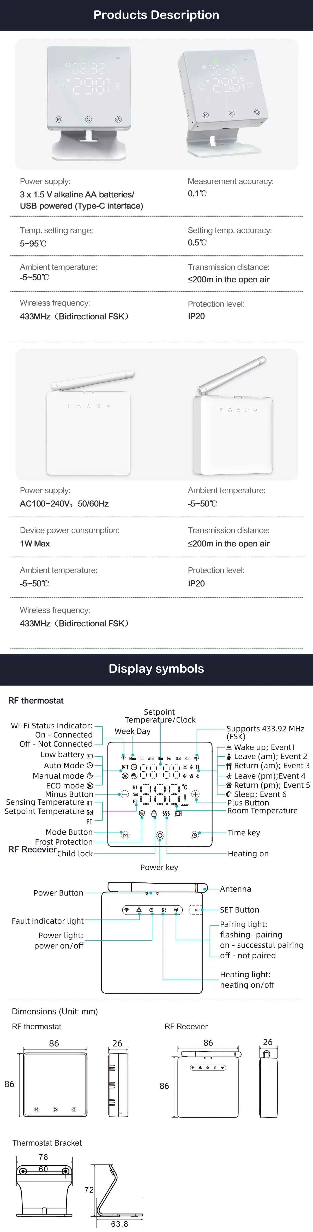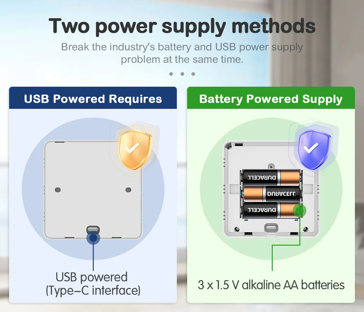 알카라인 배터리 및 Type-C USB 케이블 전원 공급 장치를 지원하므로 배터리 전원이 부족할 때 서모 스탯을 제어 할 수 없도록 걱정할 필요가 없습니다.