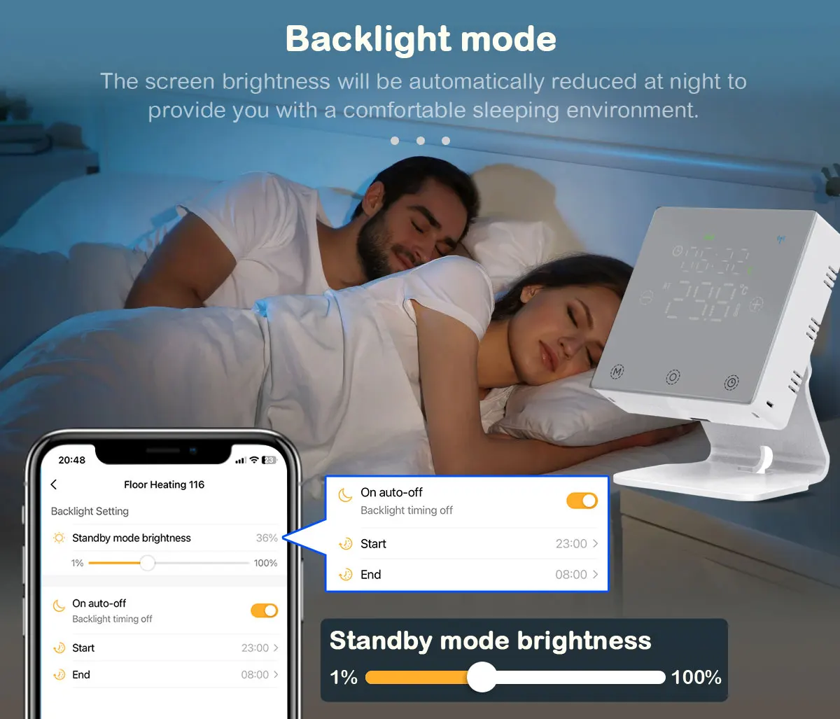 밤에는 화면 밝기가 자동으로 감소하여 따뜻한 수면 환경을 제공합니다.