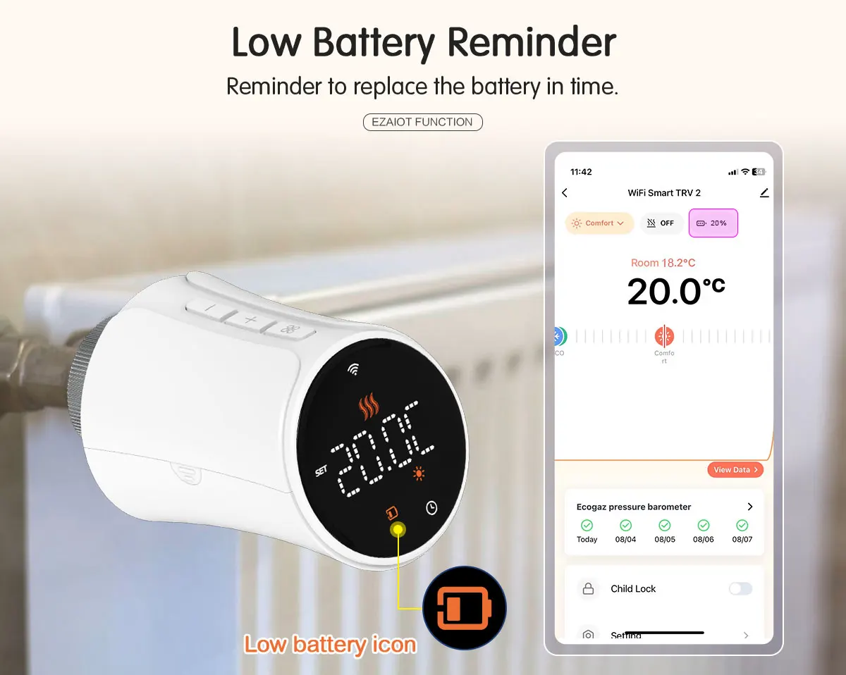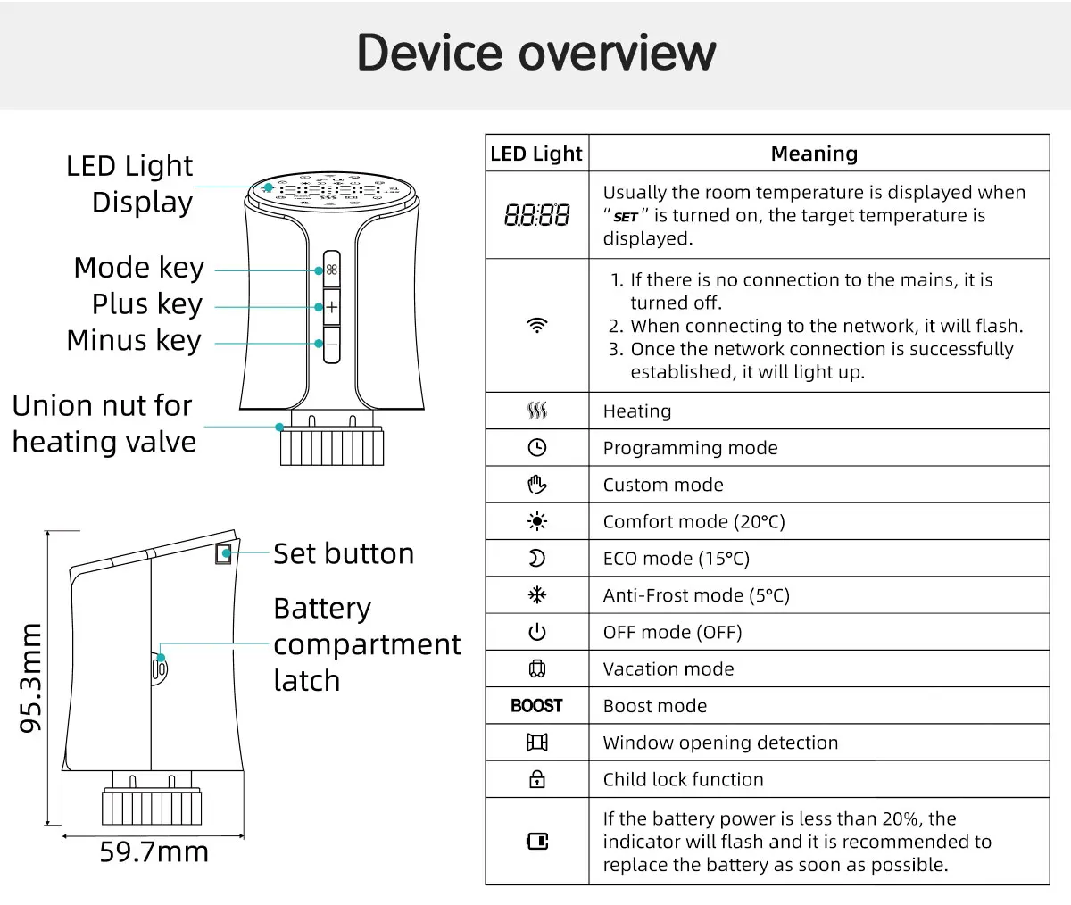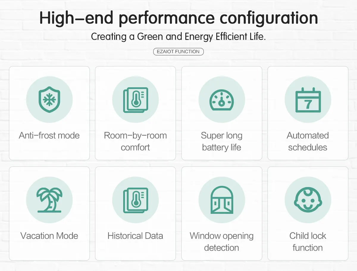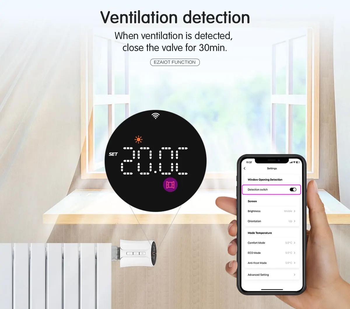 【창 열기 감지】-온도가 급격히 떨어지면 창 개구부를 감지 할 수 있으며 밸브는 에너지 절약 및 환경 보호를 위해 30 분 동안 가열을 중단합니다