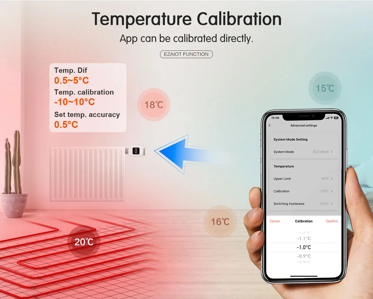 【온도 보정】-바닥과 공기 온도에 차이가있는 경우 앱을 통해 보정 값을 설정하여 최종 온도가 이상적인 값에 도달하도록 할 수 있습니다
