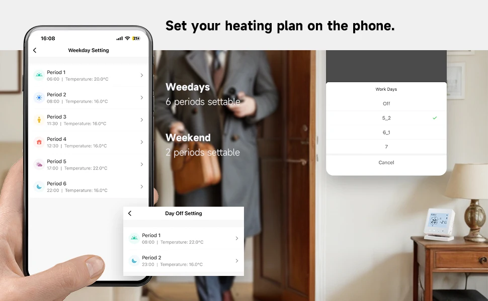 【프로그래밍 가능】: 3 가지 프로그래밍 모드 (5 + 2/6 + 1/7) 와 하루에 6 가지 다른 시간 동안 서로 다른 온도를 설정할 수있는 기능으로 앱에서 또는 수동으로 프로그래밍 할 수 있습니다.