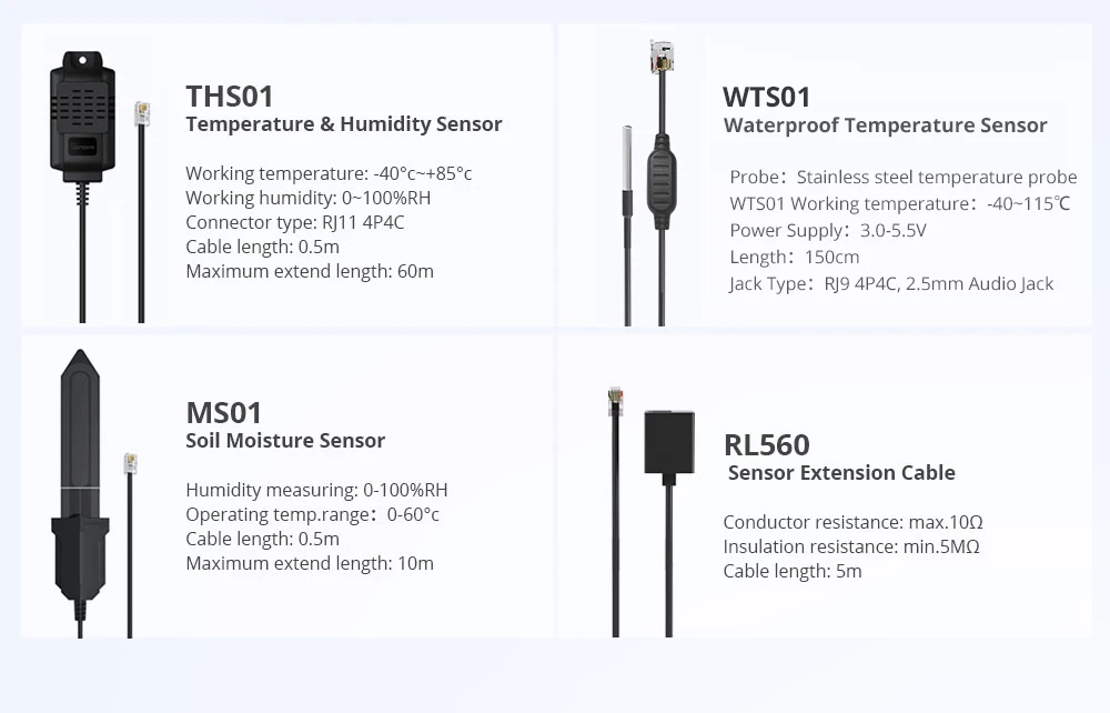 참고 2:RL560 은 RJ9 의 새로운 센서 연장 케이블로 SONOFF 온도 및 습도 센서를 연결하여 장치의 거리를 연장 할 수 있습니다. WTS01, THS01 은 60M 까지, MS01 토양 수분 센서는 10M 까지 확장할 수 있습니다.