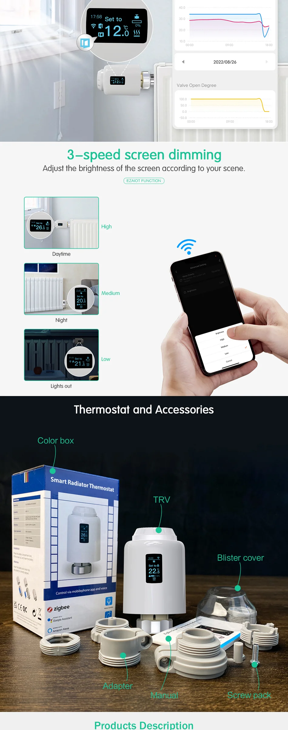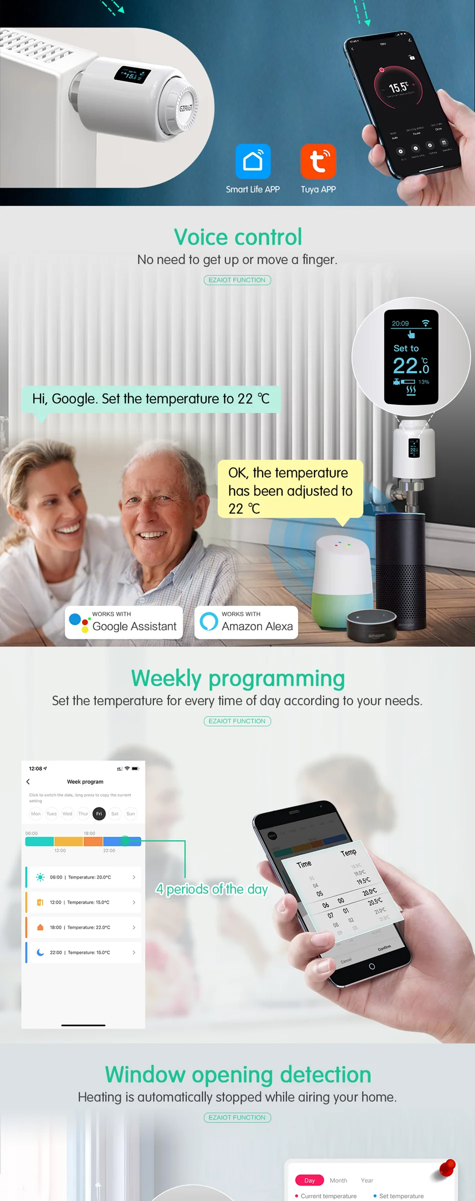 TRV는 다른 온도 설정을 지원합니다.7 일 및 4 시간 기간.일일 일정에 따라 일일 실내 온도를 사용자 정의 할 수 있습니다.