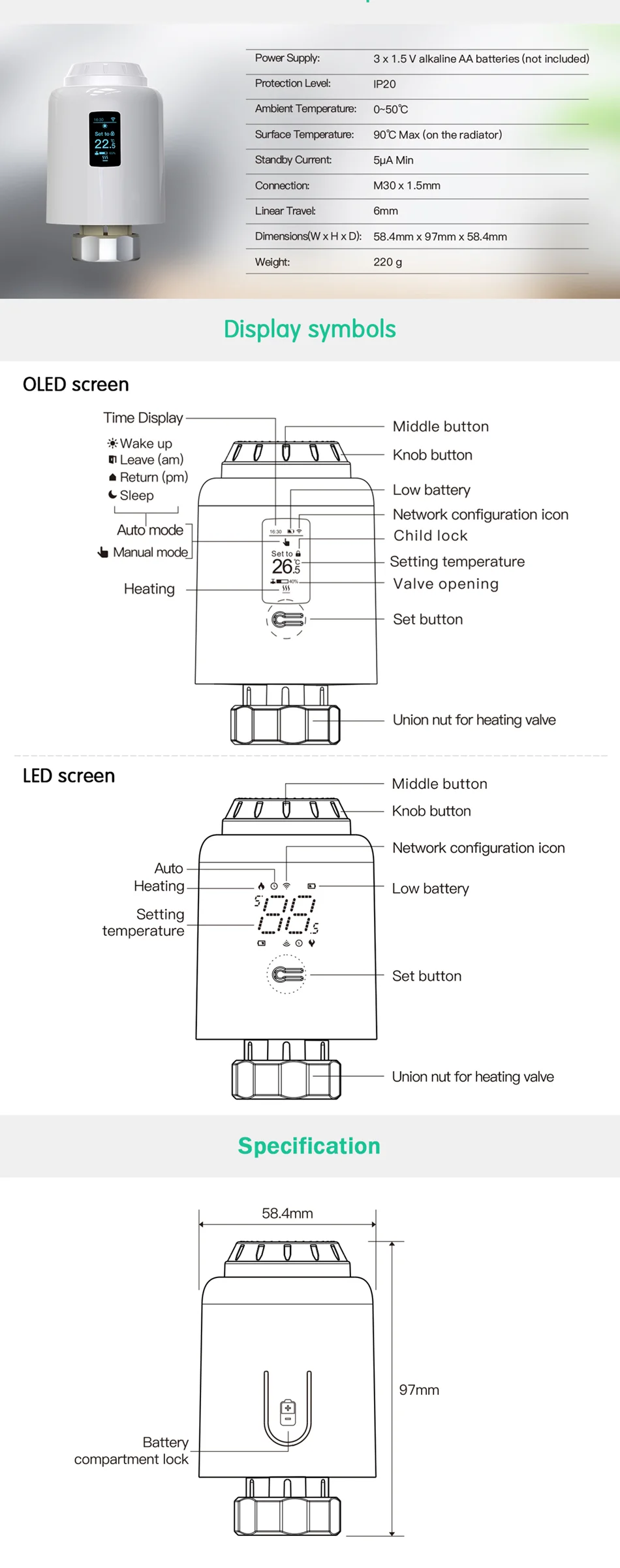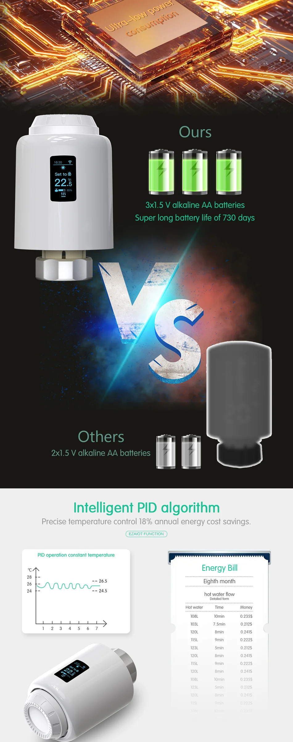 시장에 나와있는 2 개의 알카라인 배터리와 비교하여 TRV가 장착되어 있습니다.3 배터리로,저전력 칩이 장착되어있어730 일 동안 지속됩니다.