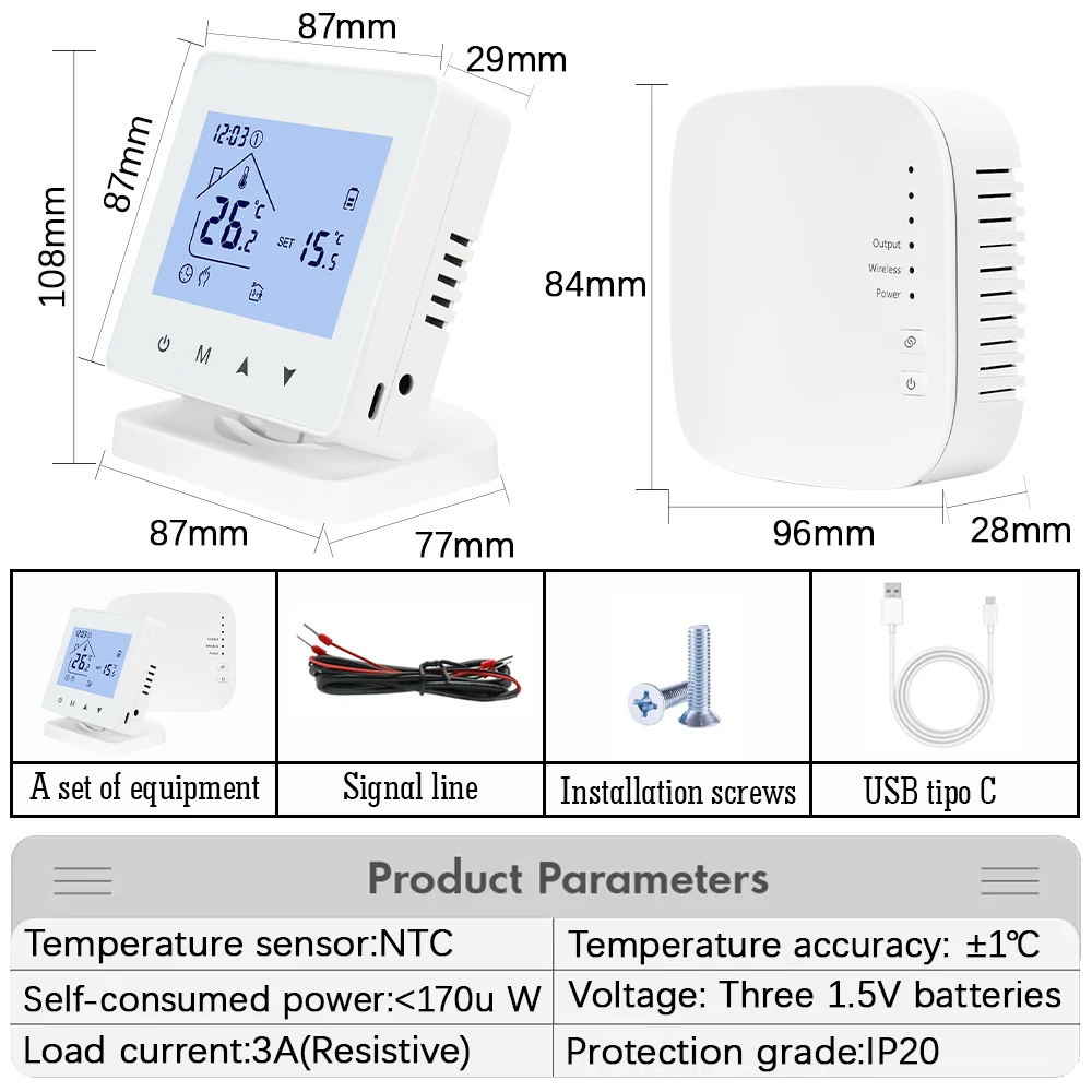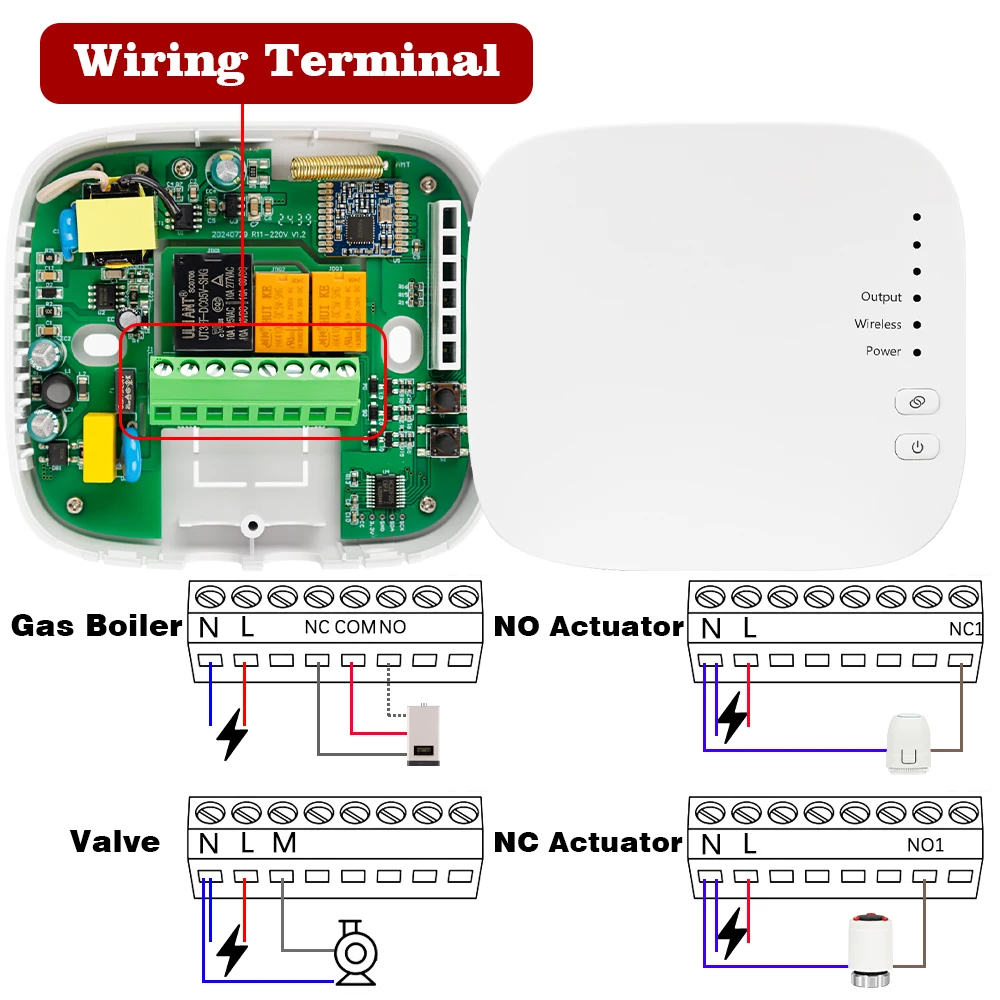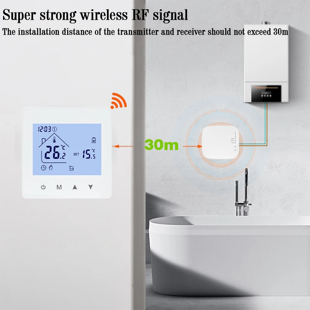 R9-WIFI:WIFI 온도 조절기는 Tuya APP 및 스마트 라이프 APP와 함께 작동 할 수 있습니다. Google Home, Yandex Alice 및 Amazon Alexa와 함께 작동하도록 지원합니다. 가스 보일러는 수신기에 연결해야합니다! USB 및 배터리 전원 지원(배터리는 패키지에 포함되어 있지 않습니다)