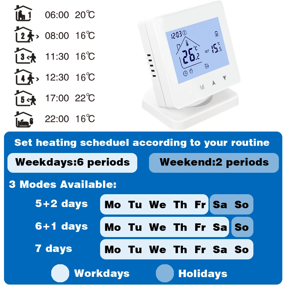 4. 집에 있든 멀리 있든 무선 온도 조절기를 사용하면 난방 시스템을 완벽하게 제어 할 수 있습니다. 인생을 더 편안하게 만들기 위해 일정을 세울 수 있습니다.