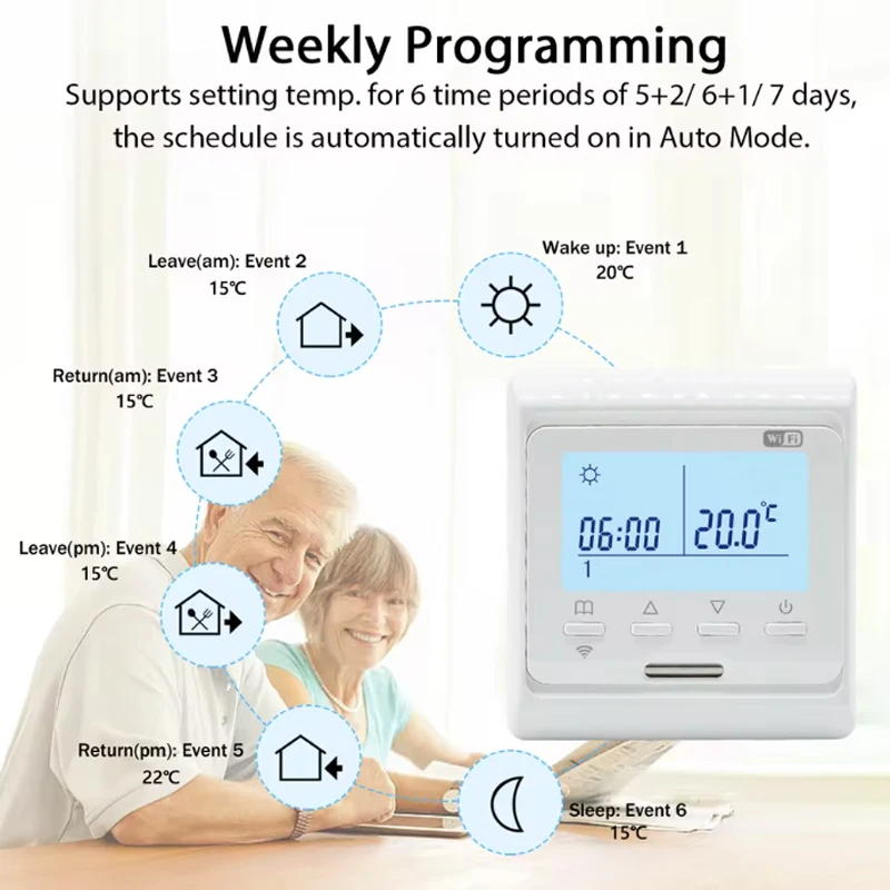 평일 및 휴식 일 당 6 시간 동안 완전 자동 또는 수동 온도 설정 지원