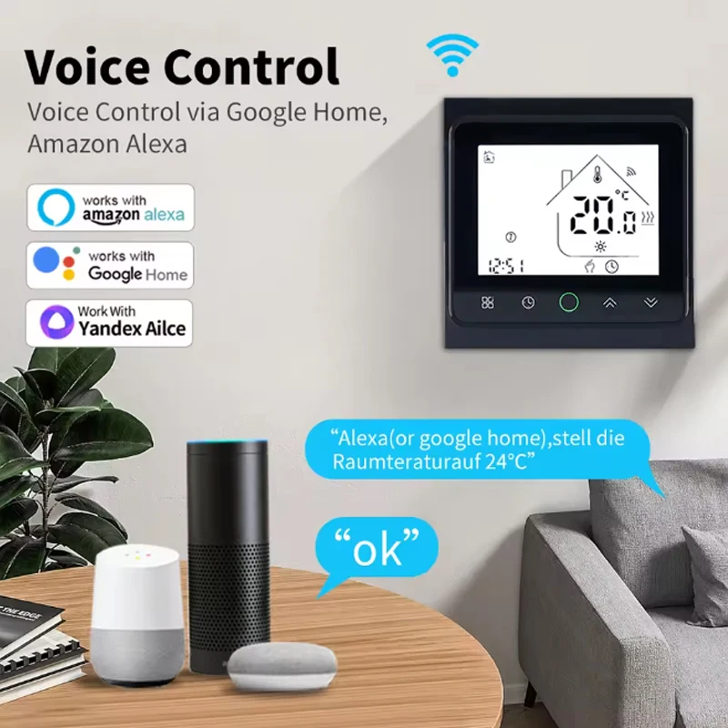 스마트 와이파이 온도 조절기는 아마존 알렉사, 구글 홈, Yandex 앨리스와 완벽하게 호환됩니다.