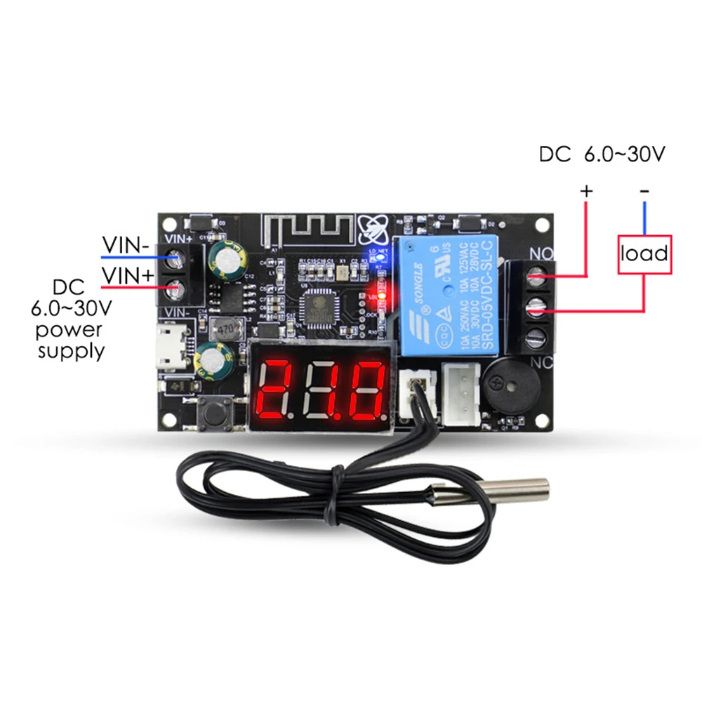 온도가 20 °C ≤ 25 °C (30-5 = 25) 일 때 릴레이가 당겨지고 가열되기 시작합니다. 온도가 30 °C ≥ 30 °C 의 설정 온도에 도달하면 릴레이가 꺼지고 가열을 멈 춥니 다.