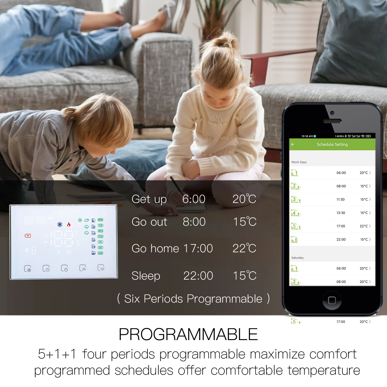 4. 주간 프로그래밍 가능: 전체 자동 프로그램 또는 수동 설정을 지원합니다. 5 + 1 + 1 일 주간 6 회 일정, 다양한 상황에 최대한 편리합니다. 전원이 꺼져있을 때 데이터 메모리. 게다가, 보다 쾌적한 온도를 즐길 수 있는 에코 모드가 있습니다.