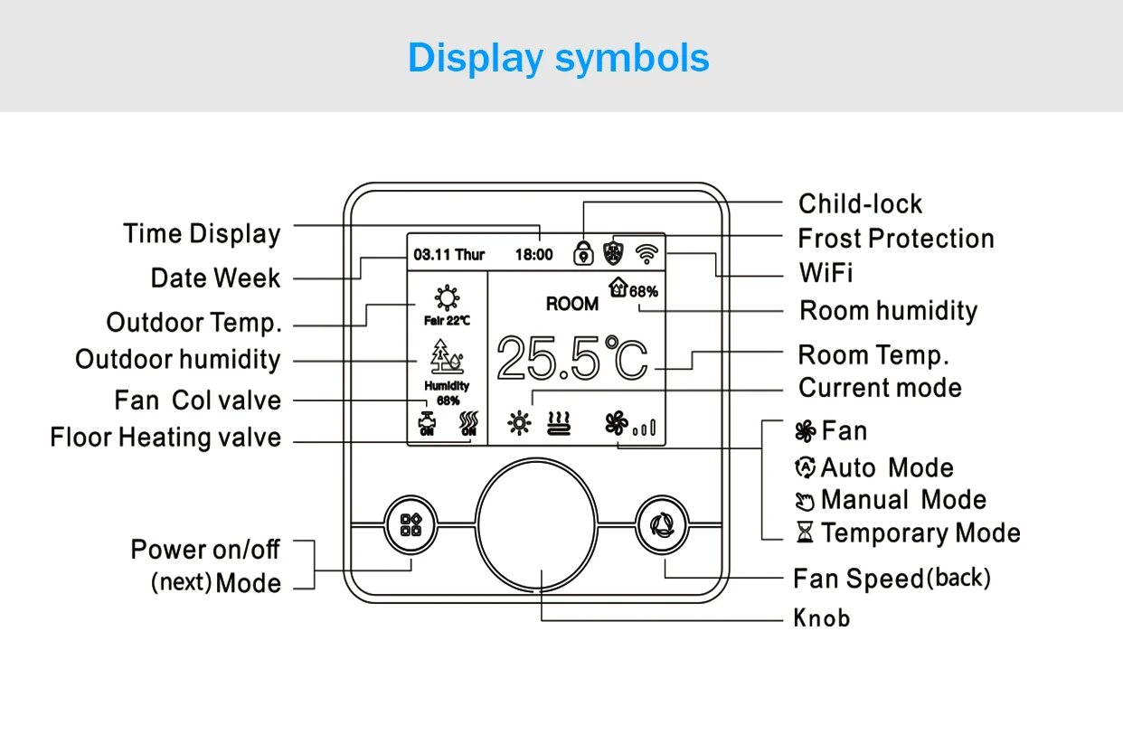 멋진 다채로운 LCD 온도 컨트롤러는 어두운 곳에서도 쉽고 편리하게 읽을 수 있습니다. 어린이도 Easy Ul 인터페이스를 사용할 수 있습니다. 이 장치는 Bluetooth 초고속 배포 네트워크를 지원합니다.