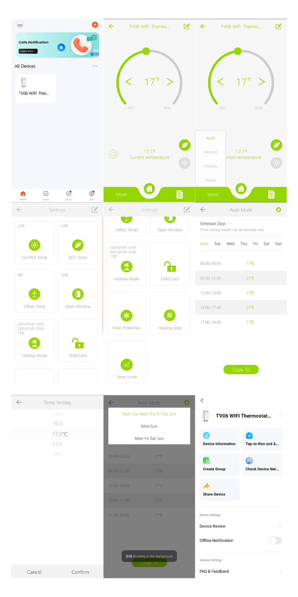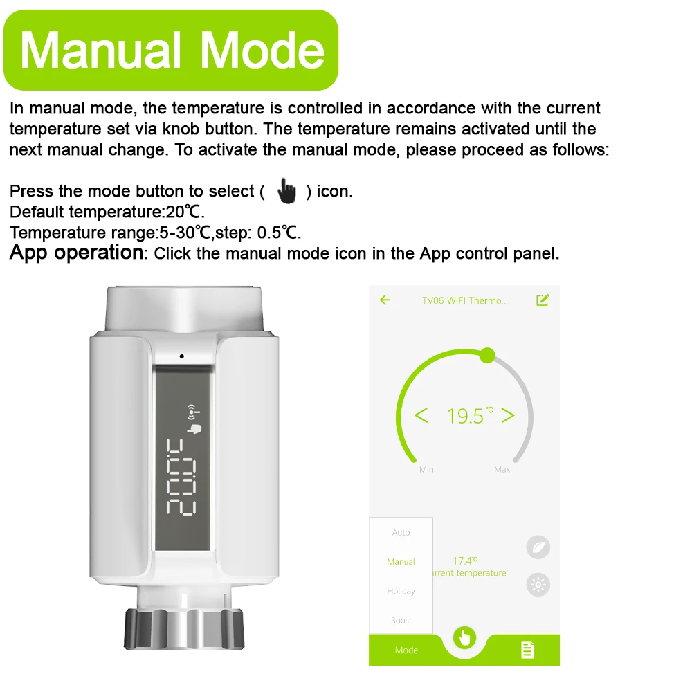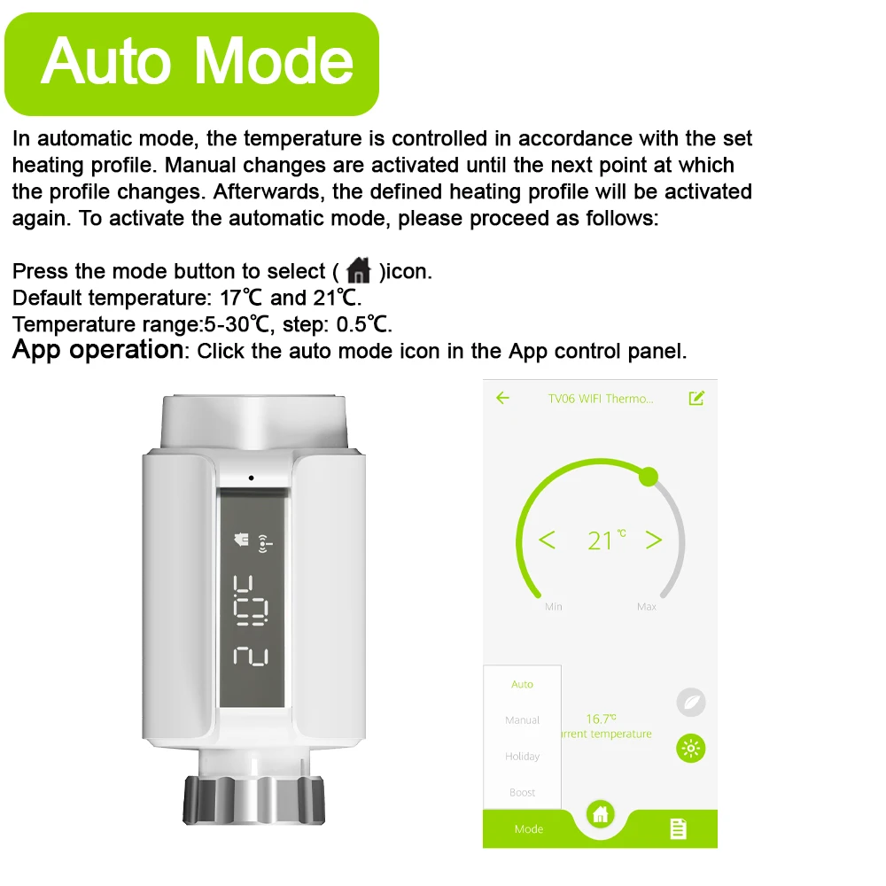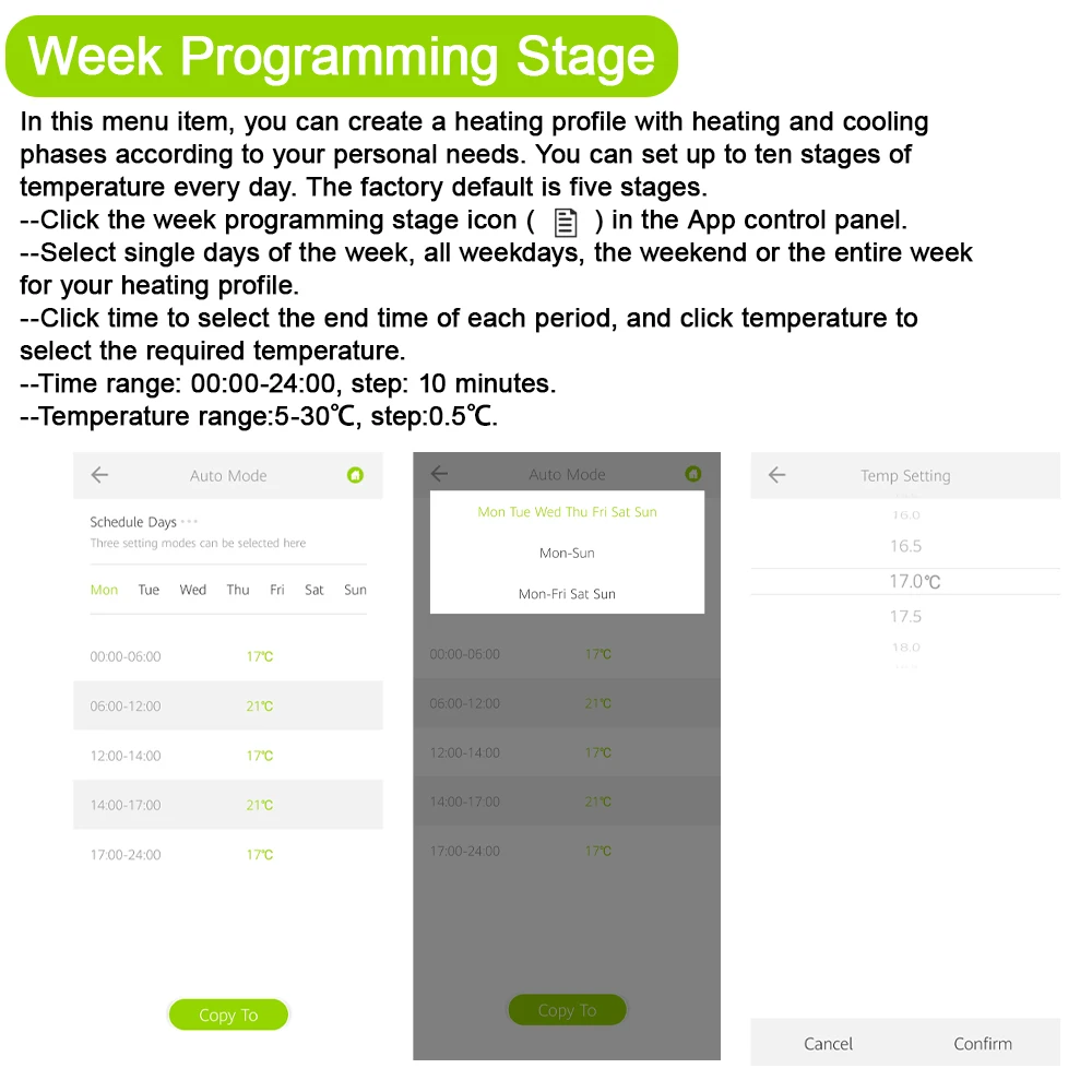 2. 주간 프로그래밍 선택과 함께 프로그래밍 가능 일정: 수동 설정 지원 5 + 2,6 + 1 및 7 일 주간 일정 옵션에 대한 6 기간, 다른 상황에 대한 최대한의 편의성을 제공하고 집 온도에 대한 맞춤형 일정을 설정합니다. 휴일 모드, 자동 모드, 부스트 모드 사용 가능. 자신의 마음을 충족시키기 위해 근무일과 휴식 모드를 선택하십시오.