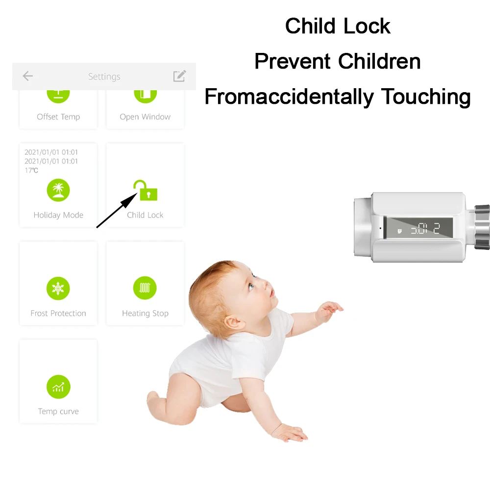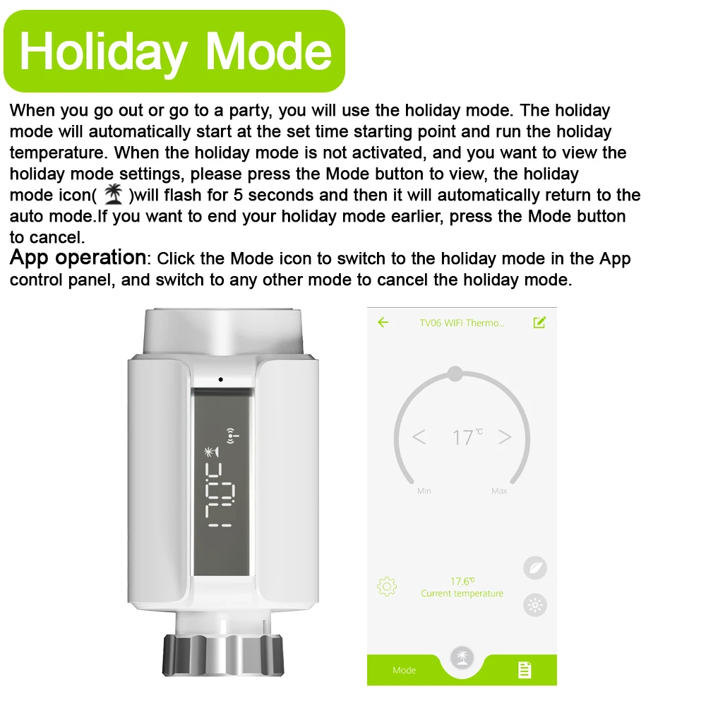 3. 열린 창 감지: 실내 온도가 갑자기 온도로 떨어지면. 임계 값, 밸브는 15 분 동안 닫힙니다. 그 후, 실내 온도. 여전히 온도보다 낮습니다. 임계 값은이 모드를 유지합니다. 게다가 섭씨 온도의 디지털 디스플레이를 쉽게 읽을 수 있습니다.