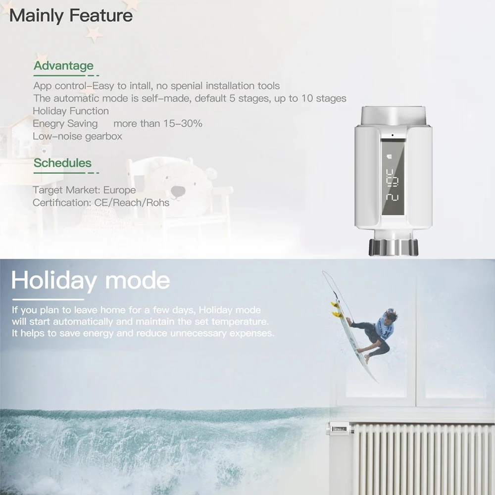 1.Smart Tuya WiFi 라디에이터 액추에이터 서모 스탯: 본체에 간단하고 선명한 LCD 디스플레이 화면이있는 새로운 미니 디자인, 라디에이터 서모 스탯에는 LCD 디지털 디스플레이 화면과 AA 배터리의 두 섹션이 있습니다. 난방 라디에이터와 함께 사용하는 특수 밸브입니다. 인위적으로 실내 온도를 설정하고, 주로 바닥 난방 시스템에 사용되어 파이프의 폐쇄 및 개방을 제어합니다. 2MQTT 설정 사용 가능.