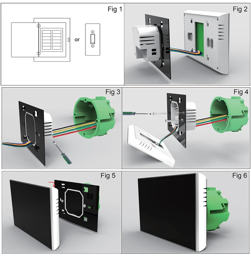 3. 아마존 에코, 구글 홈, 티몰 지니와 통합.설치온도 조절기는 표준 86mm 패턴 상자 또는 유럽 60mm 패턴 상자 내에 적합한 적 설치입니다.1 단계. 힘을 유지하십시오. 그림 1 참조2 단계. LCD 부품을 회전시켜 장착 플레이트를 제거합니다. 그림 2 참조.3 단계. 전원 공급 장치를 연결하고 적절한 단자에로드하십시오 (자세한 내용은 "온도 조절기 배선" 및 그림 3 참조).4 단계. 상자에 나사를 사용하여 장착 판을 벽에 고정하십시오. 그림 4 참조.5 단계. 회전을 통해 열전달 장치와 장착 판의 몸체를 고정하십시오. 그림 5 참조.6 단계. 설치가 완료되었습니다. 그림 6 참조.설치 메모:
