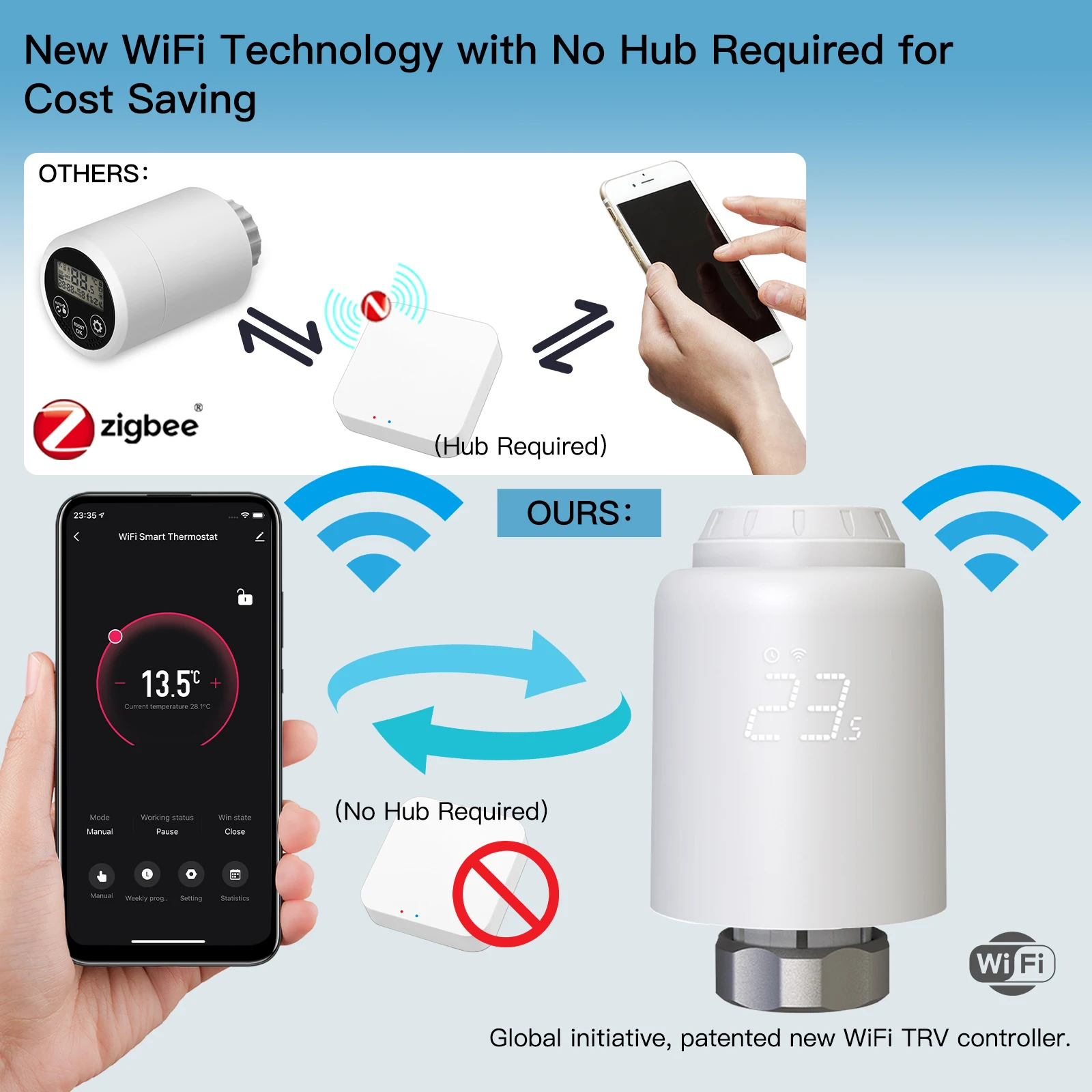 허브가 필요없는 WiFi 스마트 긴 배터리 수명 온도 조절 라디에이터 밸브:이것은 새로운 WiFi 유형입니다.초저전력 WiFi 기술스마트 라이프 APP로의 간단한 WiFi 구성에 Tuya ZigBee 허브가 필요하지 않습니다. 허브를 구입하지 않고도 가장 편안한 온도와 비용 절감 방법을 즐기기 위해 APP에서 자동 및 수동 모드 선택 사항이있는 스마트 폰을 통해 어디에 있든 상관없이 집 라디에이터 밸브를 무선 제어합니다. 물 속의 미네랄이 밸브를 막히는 것을 방지하기위한 스케일 방지.