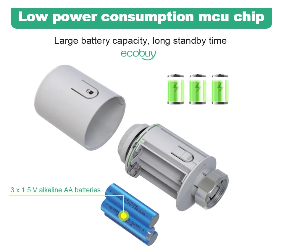 Our smart Zigbee TRV Compared with 2 alkaline batteries on the market, our TRV is equippedwith 3 batteries,and it is equipped with a low-power chip