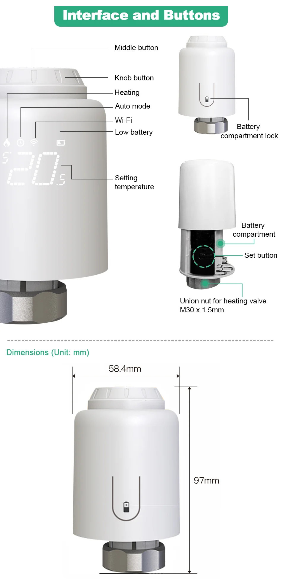 ? 원격 제어를위한 와이파이 헤드:Wifi 헤드가 장착 된이 자동 온도 조절 밸브는 원격 제어 작동이 가능하여 어디에서나 집 온도를 관리 할 수있는 기능을 제공합니다.