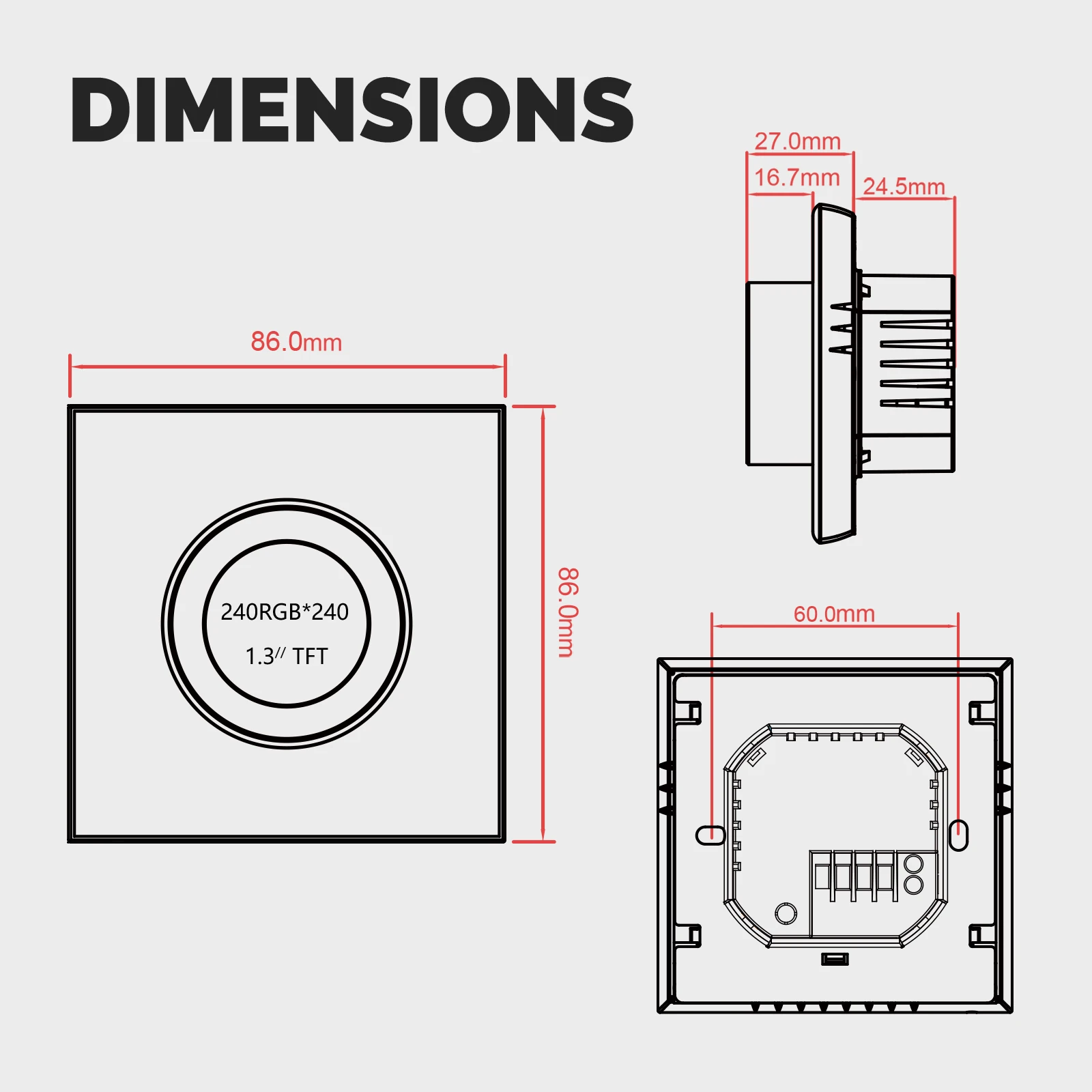 숨겨진 상자에 대한 광범위한 적응성컴팩트 한 크기로 86mm 정사각형 카세트 및 60mm 유럽식 원형 카세트와 같은 다양한 크기의 숨겨진 상자에 쉽게 설치할 수 있습니다.장치 공유Samrt 온도 조절기를 함께 제어하기 위해 가족 구성원에게 기기 공유