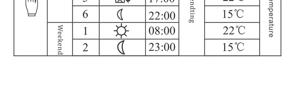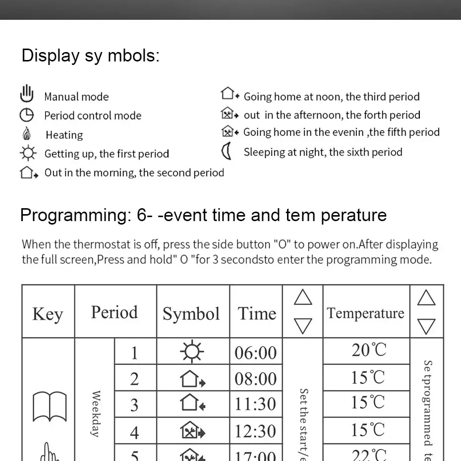 【주간 프로그램 가능】 온도 조절기는 매일 6 가지 시간 모드에 따라 다른 온도 설정을 지원합니다.