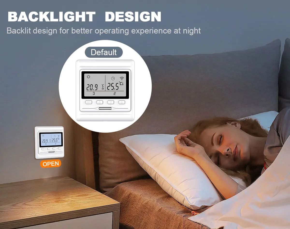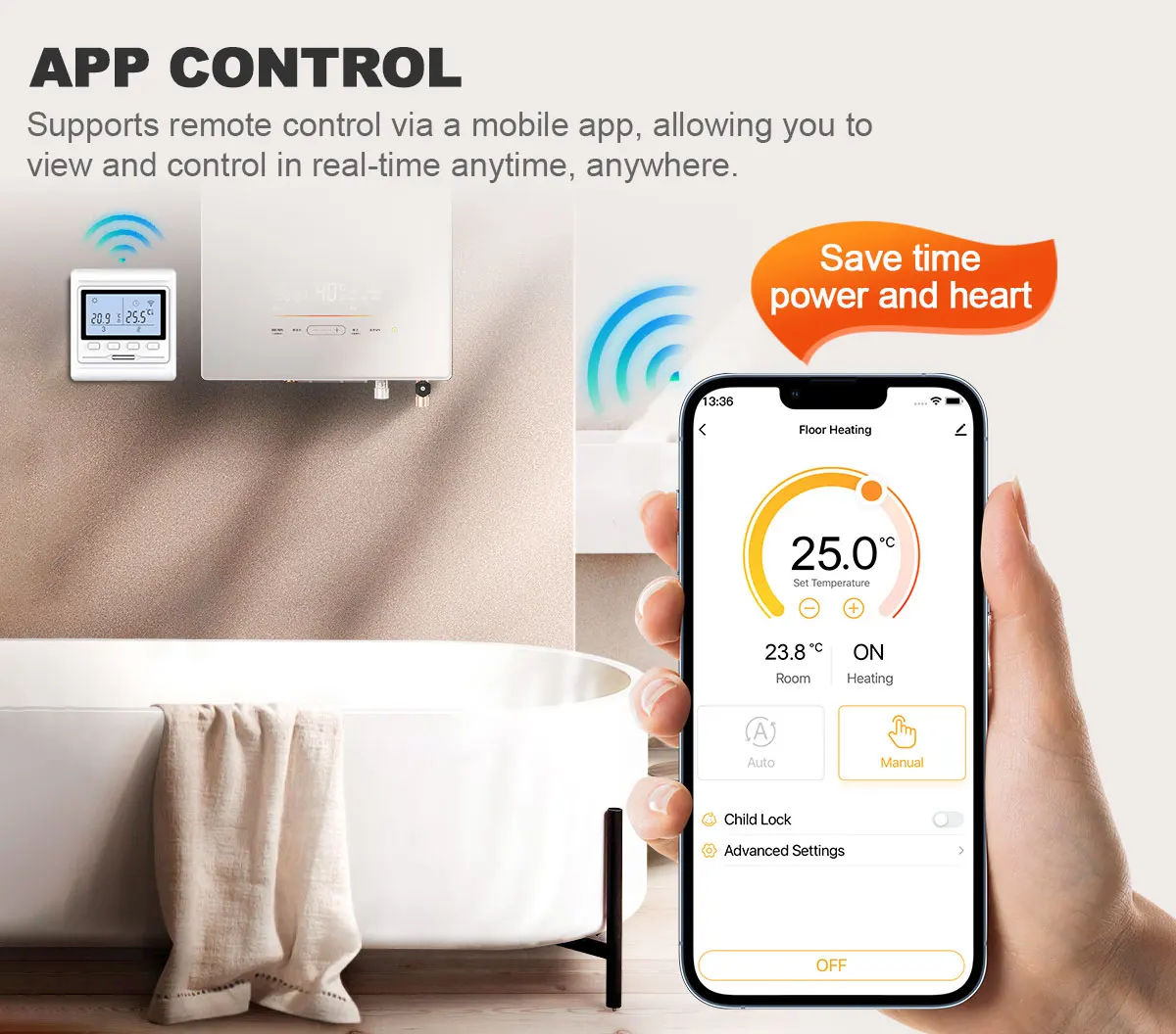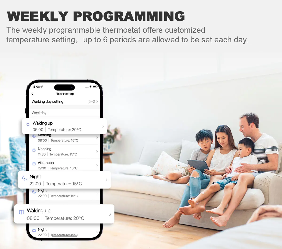 평일 및 휴식 일 당 6 시간 동안 완전 자동 또는 수동 온도 설정 지원