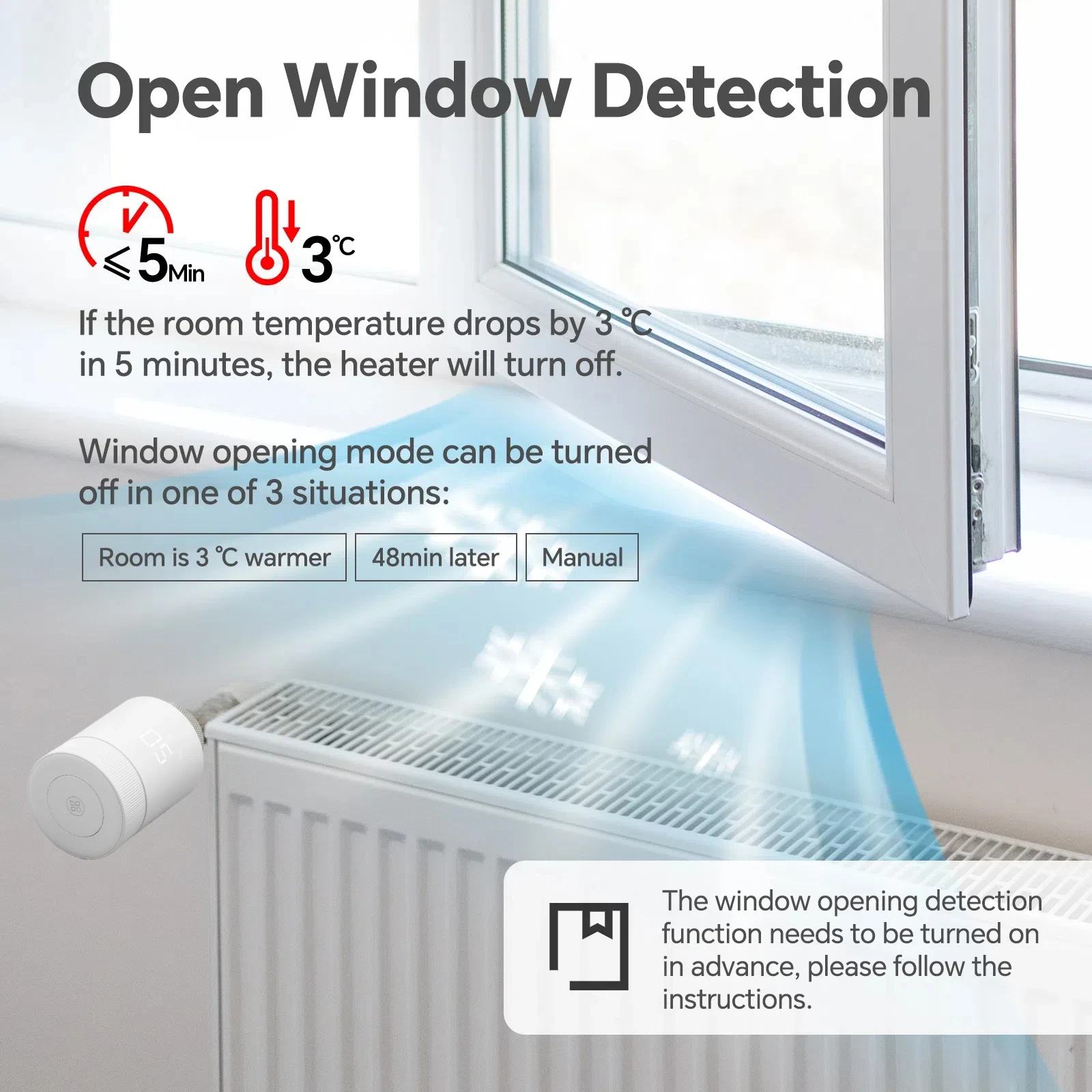 【창 열기 기능】 서모 스탯이 짧은 시간 내에 온도의 현저한 감소를 감지하면 자동 온도 조절 밸브가 창 열기 기능을 활성화하고 가열을 중지합니다.