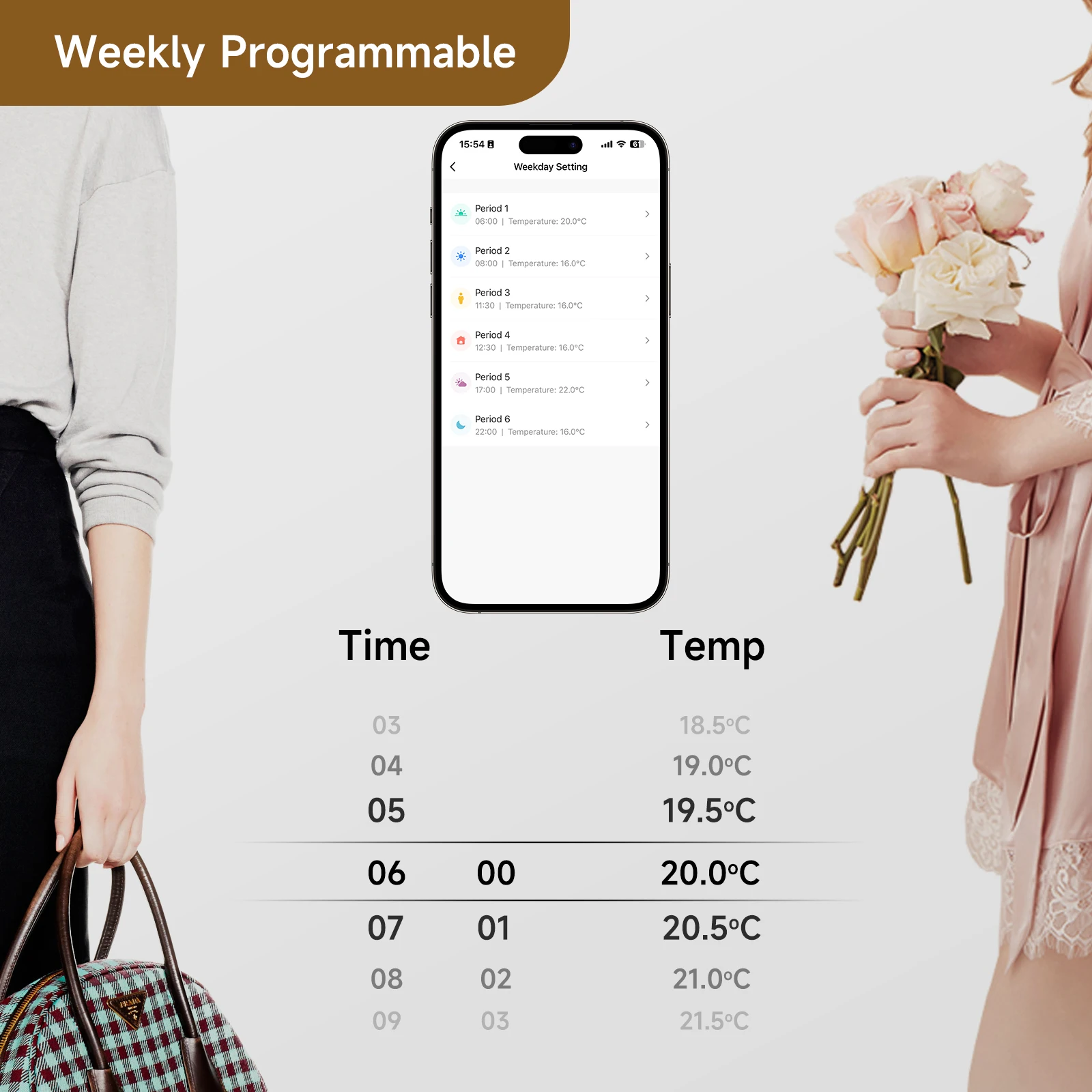 【프로그램】 WiFi 모델: 주간 프로그래밍, 5 + 2/6 + 1/7, 3 가지 프로그래밍 모드. 온도는 평일에는 하루 6 시간, 주말에는 2 시간으로 설정할 수 있습니다.