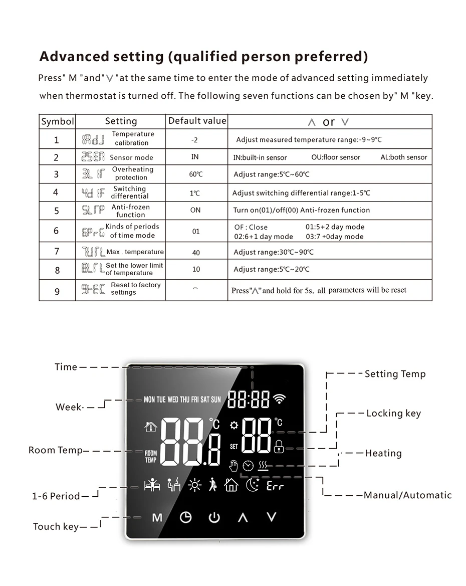 온도 조절기는 매일 6 가지 시간 모드로 다른 온도 설정을 지원합니다.