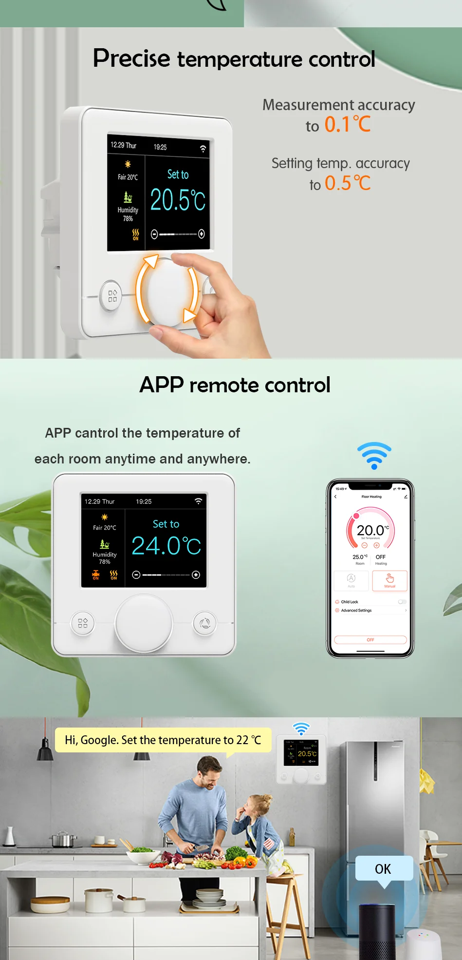 By comparing the ambient temperature with the set temperature, the operation of the floor heating thermostat is controlled to improve comfort and achieve the purpose of energy saving.